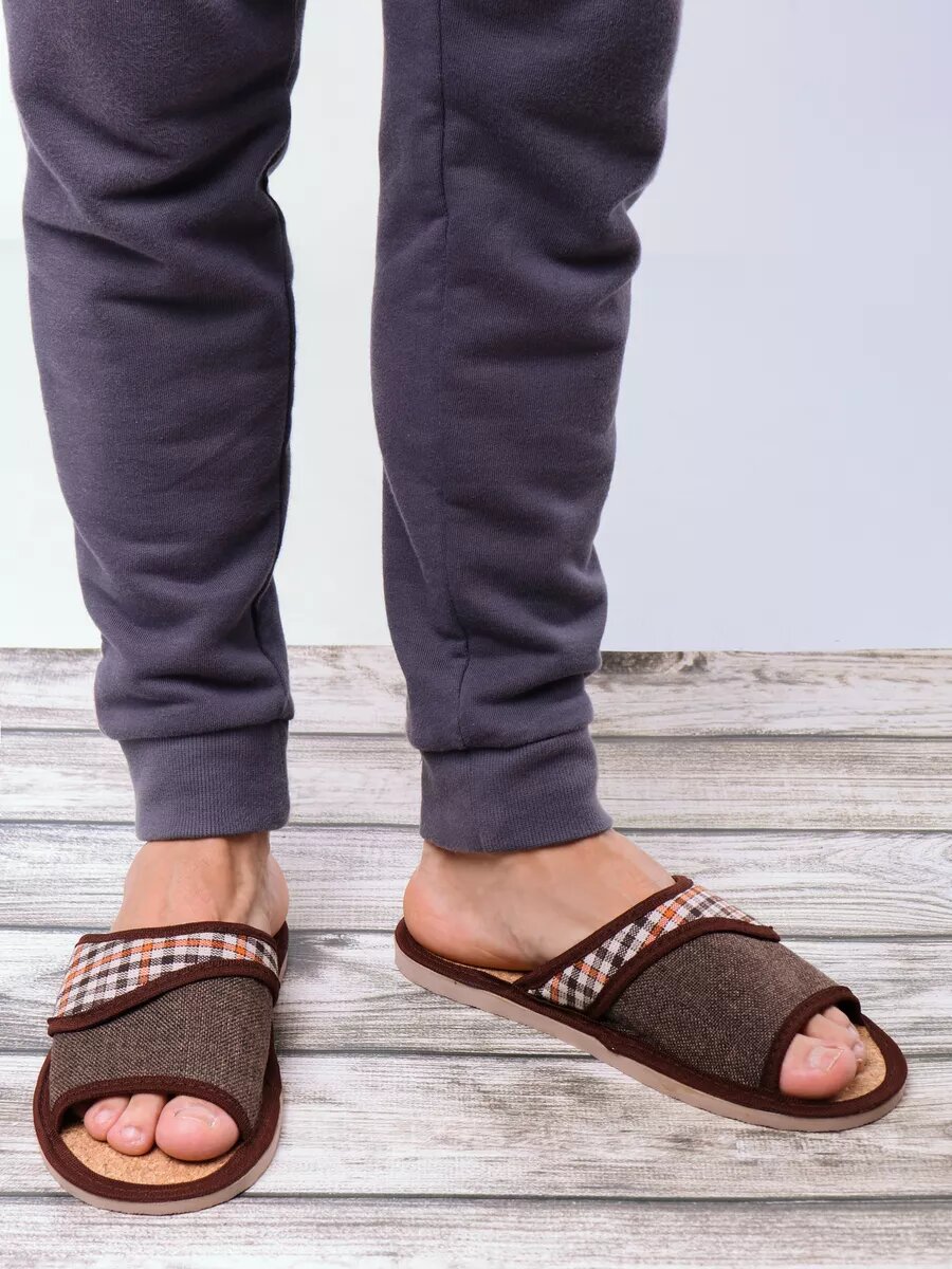 Отзывы на Мужские домашние тапки "LepiloV", открытые, на пробковой стельке с отворотом. Размер 39. Рыжая клетка.