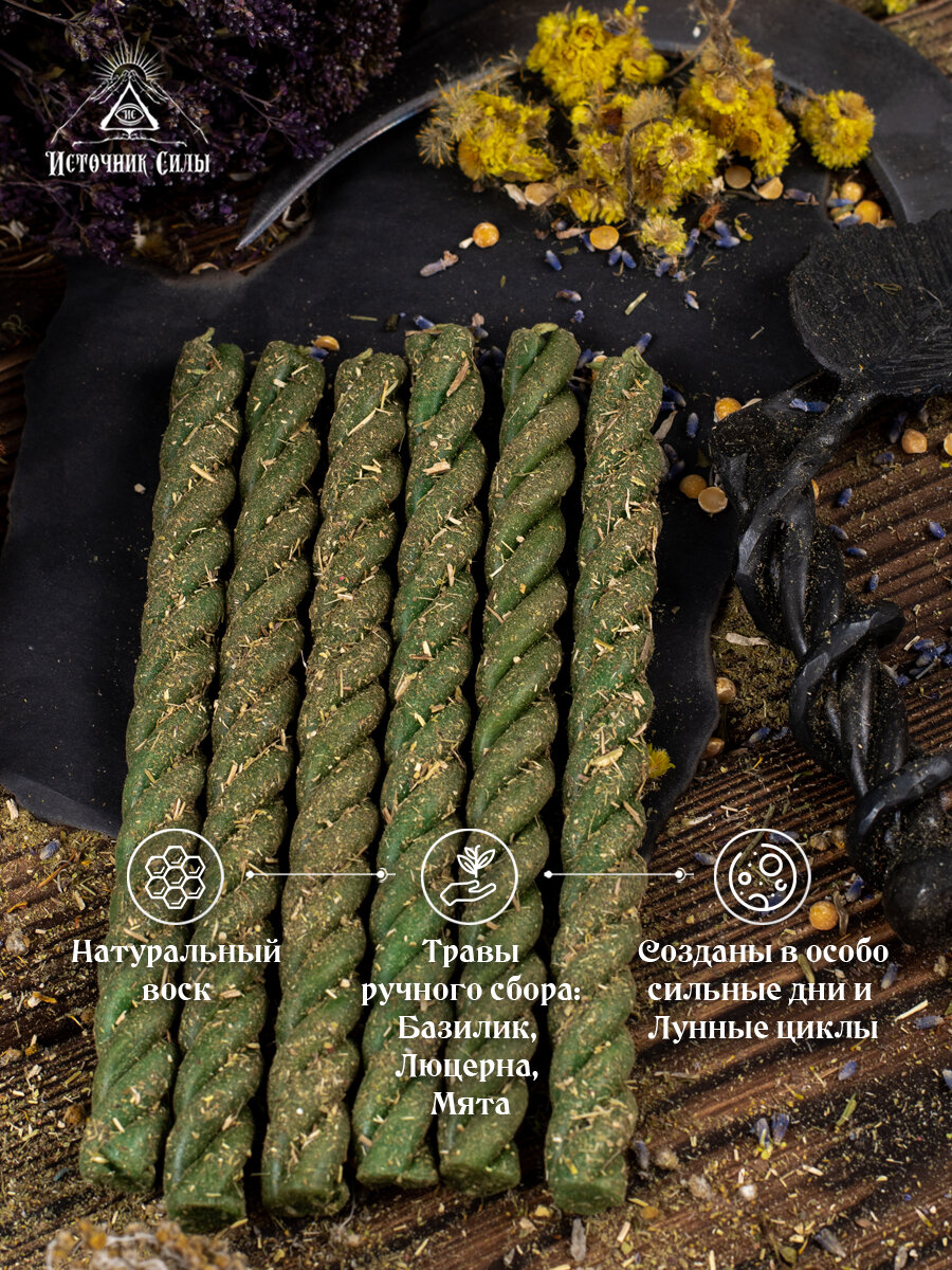 10 цен на Свечи зеленые восковые скрутки с травами на деньги 6 шт.