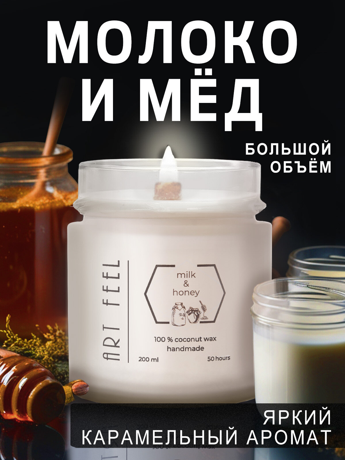 Ароматизированная свеча ART FEEL с запахом молоко И МЁД / Двойной деревянный фитиль с треском /100мл / 25ч горения / Ручная работа / Handmade 313 ₽