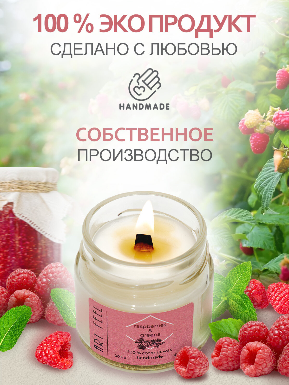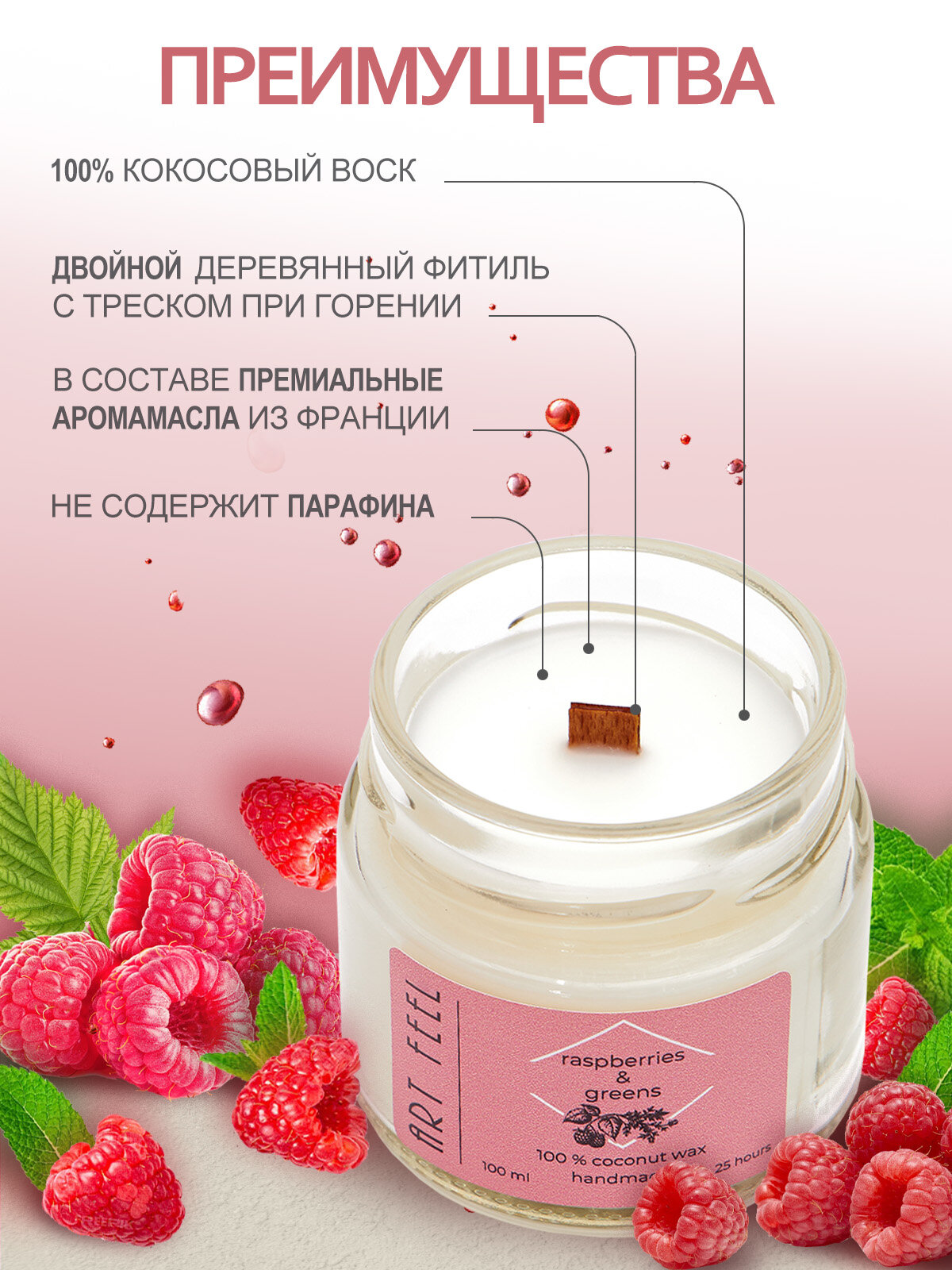 Ароматизированная свеча ART FEEL с запахом малина И зелень / Двойной деревянный фитиль с треском /100мл / 25ч горения / Ручная работа / Handmade информация: