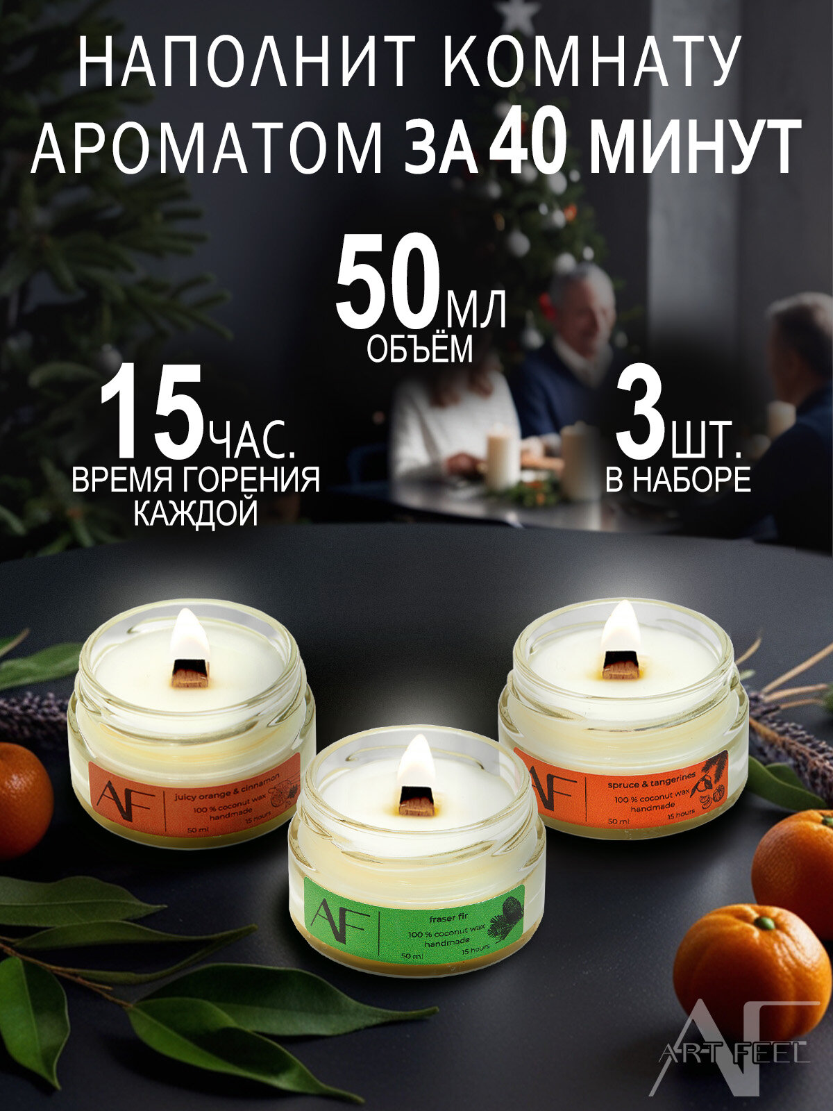 Свечи "ART FEEL" - набор из 3-х свечей с ароматом апельсина и корицы, елка и мандарины, пихта Фрейзера информация: