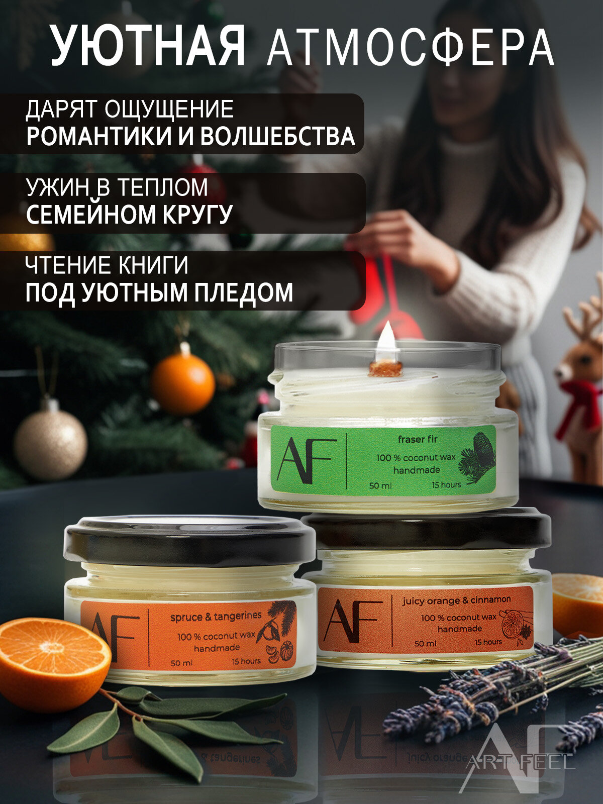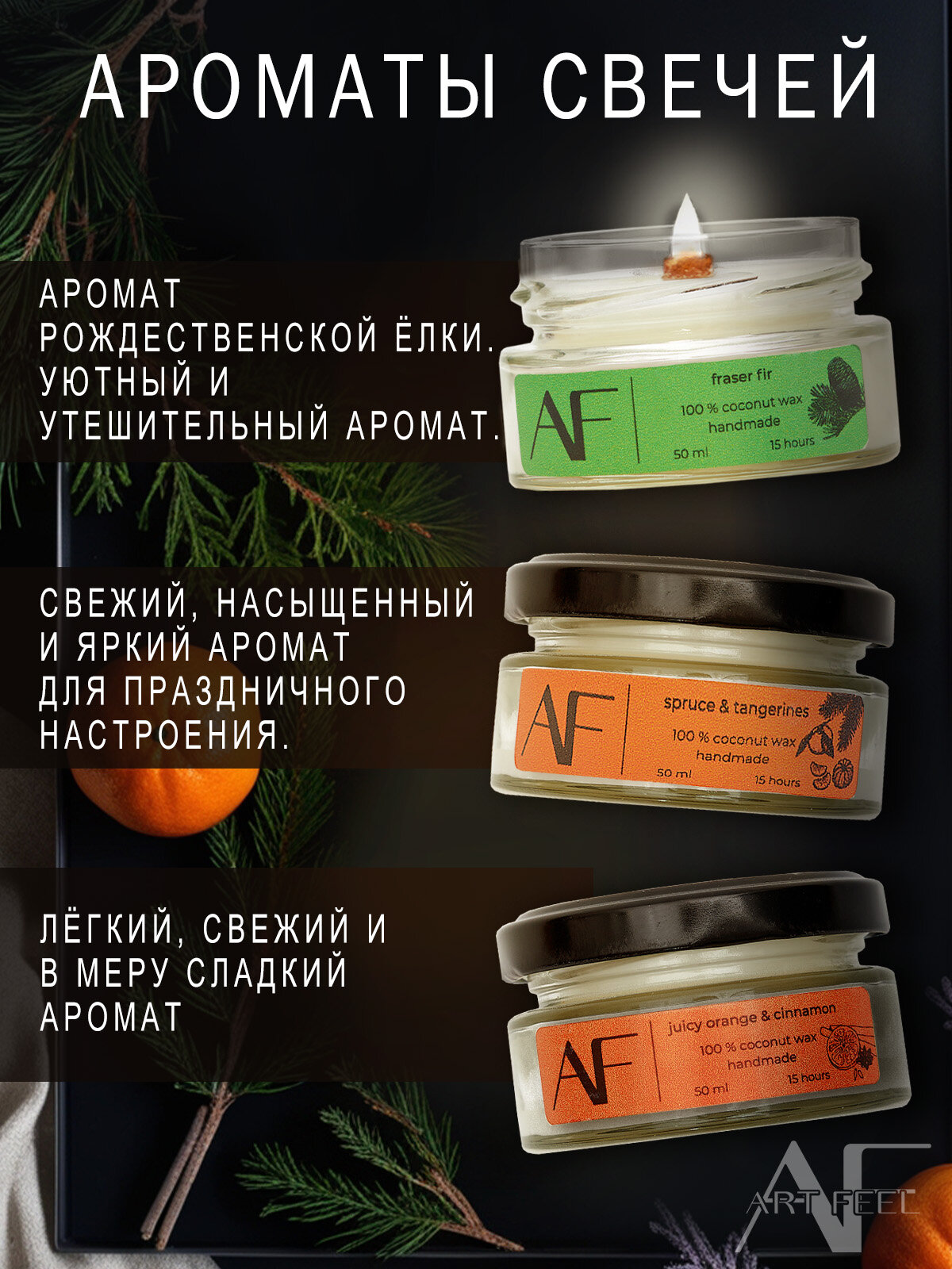 Отзывы на Свечи "ART FEEL" - набор из 3-х свечей с ароматом апельсина и корицы, елка и мандарины, пихта Фрейзера