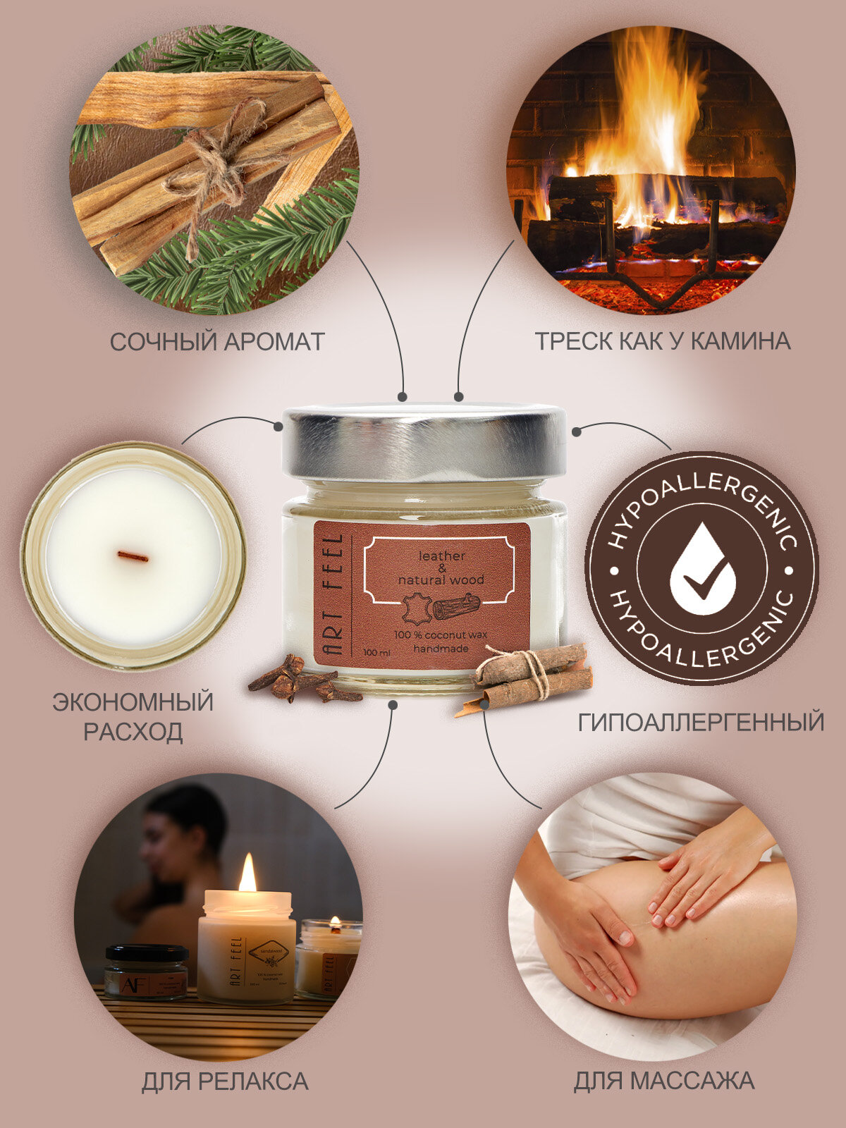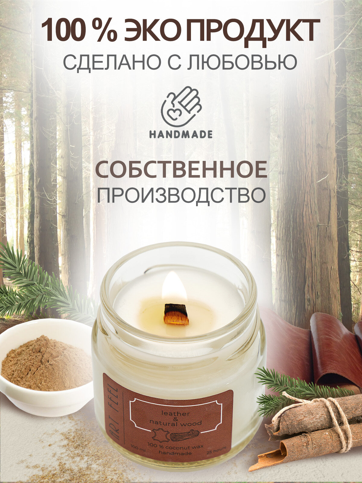 Ароматизированная свеча ART FEEL с запахом кожи И древесины / Двойной деревянный фитиль с треском /100мл / 25ч горения / Ручная работа / Handmade информация:
