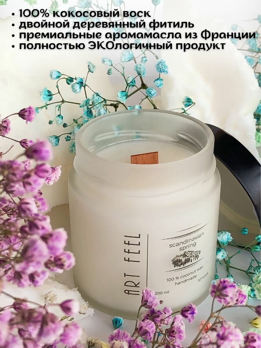 Ароматизированная свеча ART FEEL с запахом скандинавская весна / Двойной деревянный фитиль с треском /100мл / 25ч горения / Ручная работа / Handmade 300 ₽