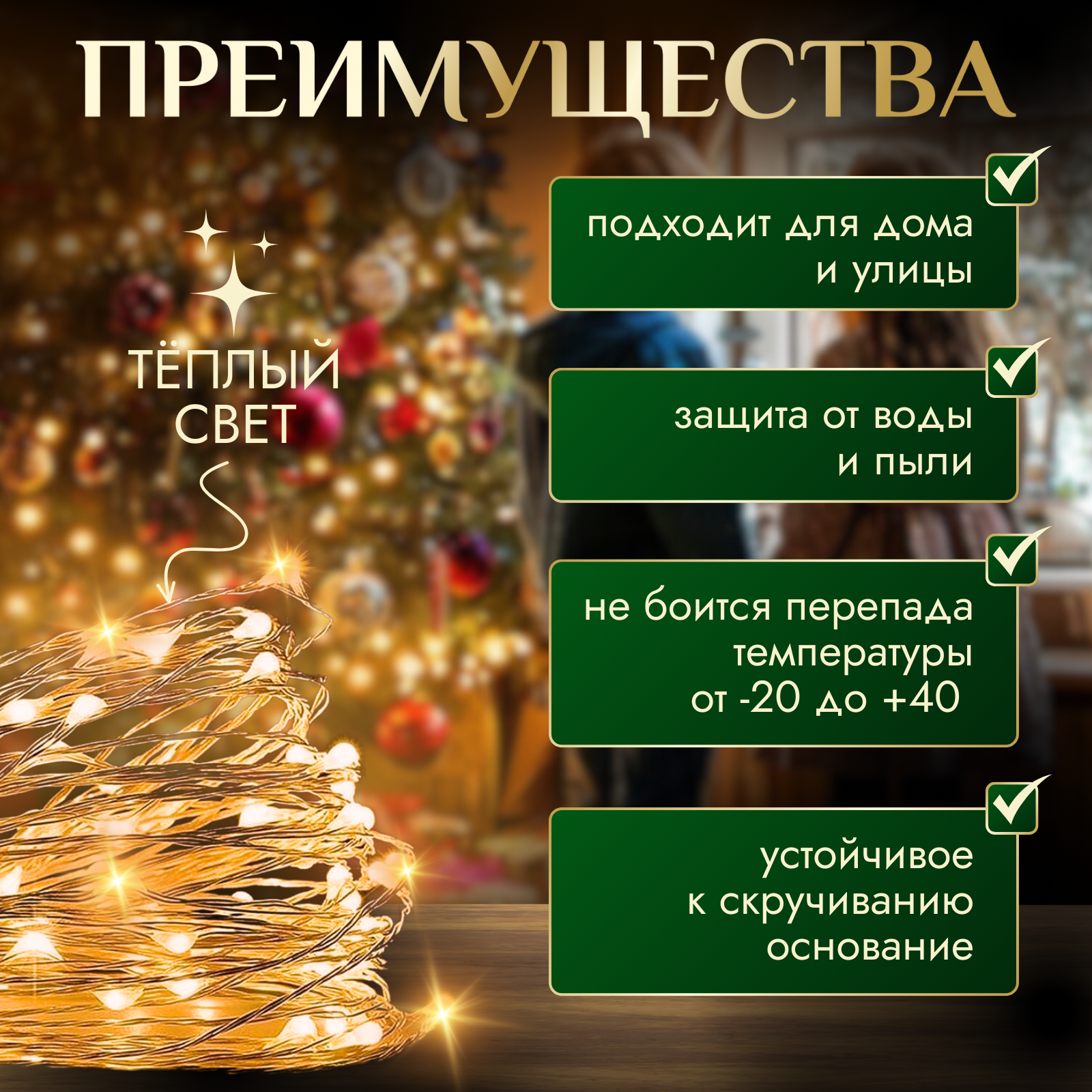 Гирлянда светодиодная, электрическая гирлянда, новогодняя гирлянда нить на елку, 15 м, теплый белый, прозрачный провод, контроллер режимов