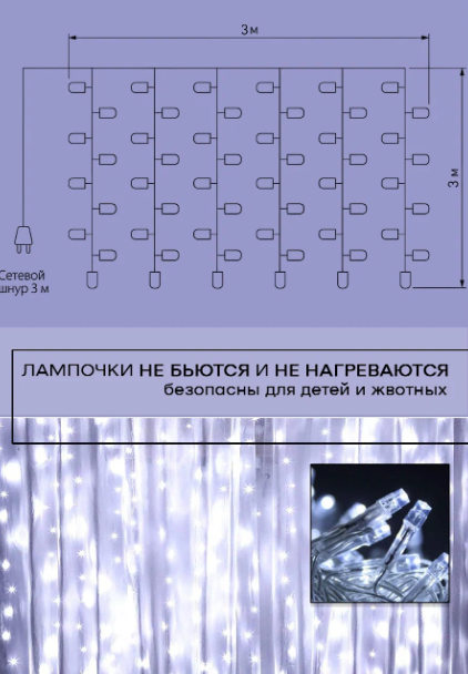 Гирлянда электрическая светодиодная 3х3 м. Белая / Гирлянда штора занавес новогодняя информация: