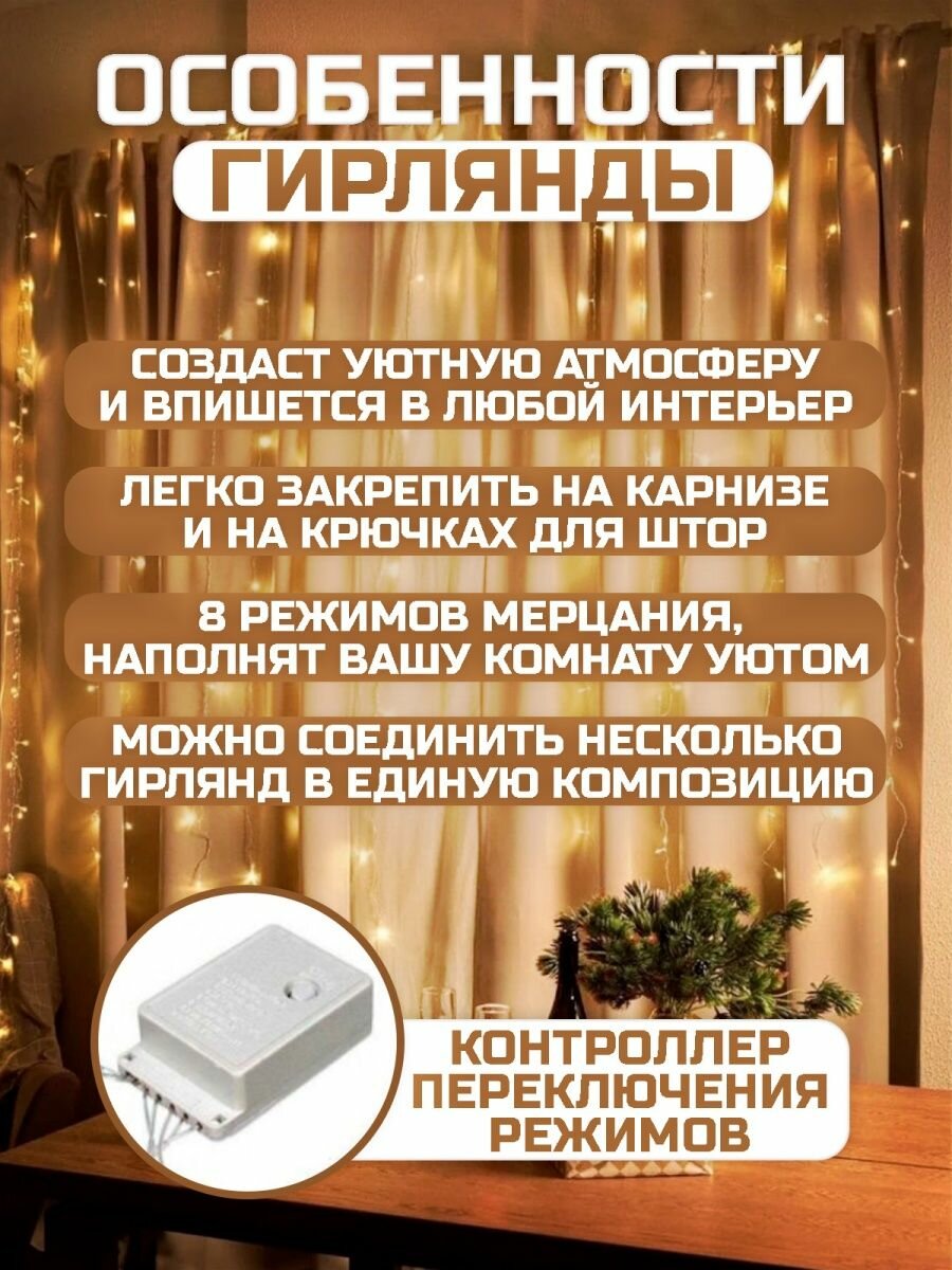 Гирлянда штора 3х2 на окно, теплый желтый информация: