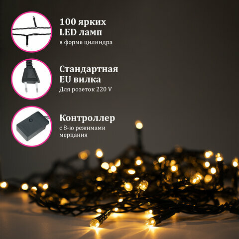Электрогирлянда-нить комнатная "Стандарт" 10 м, 100 LED, теплый белый свет, 220 V, контроллер, золотая сказка, 591346 641 ₽
