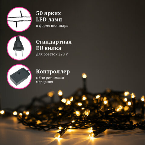 10 цен на Комплект 50 шт, Электрогирлянда-нить комнатная "Стандарт" 5 м, 50 LED, теплый белый свет, 220 V, контроллер, золотая сказка, 591343