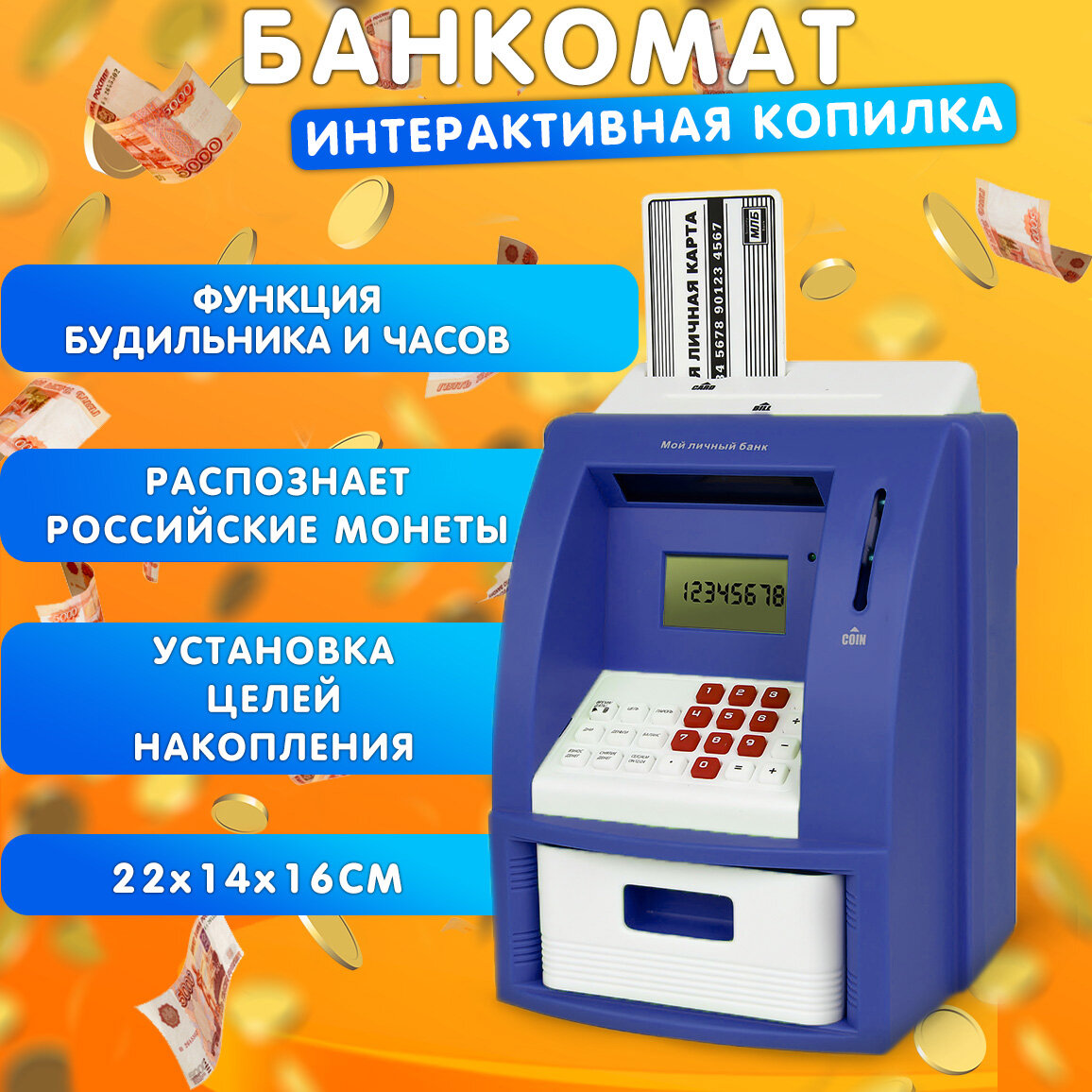 10 цен на Копилка Банкомат эврика для монет и купюр, электронная, детская, интерактивная (синий) 23 февраля, 8 марта