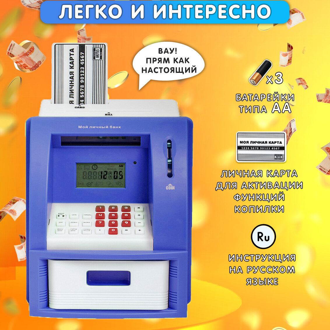 Копилка Банкомат эврика для монет и купюр, электронная, детская, интерактивная (синий) 23 февраля, 8 марта информация:
