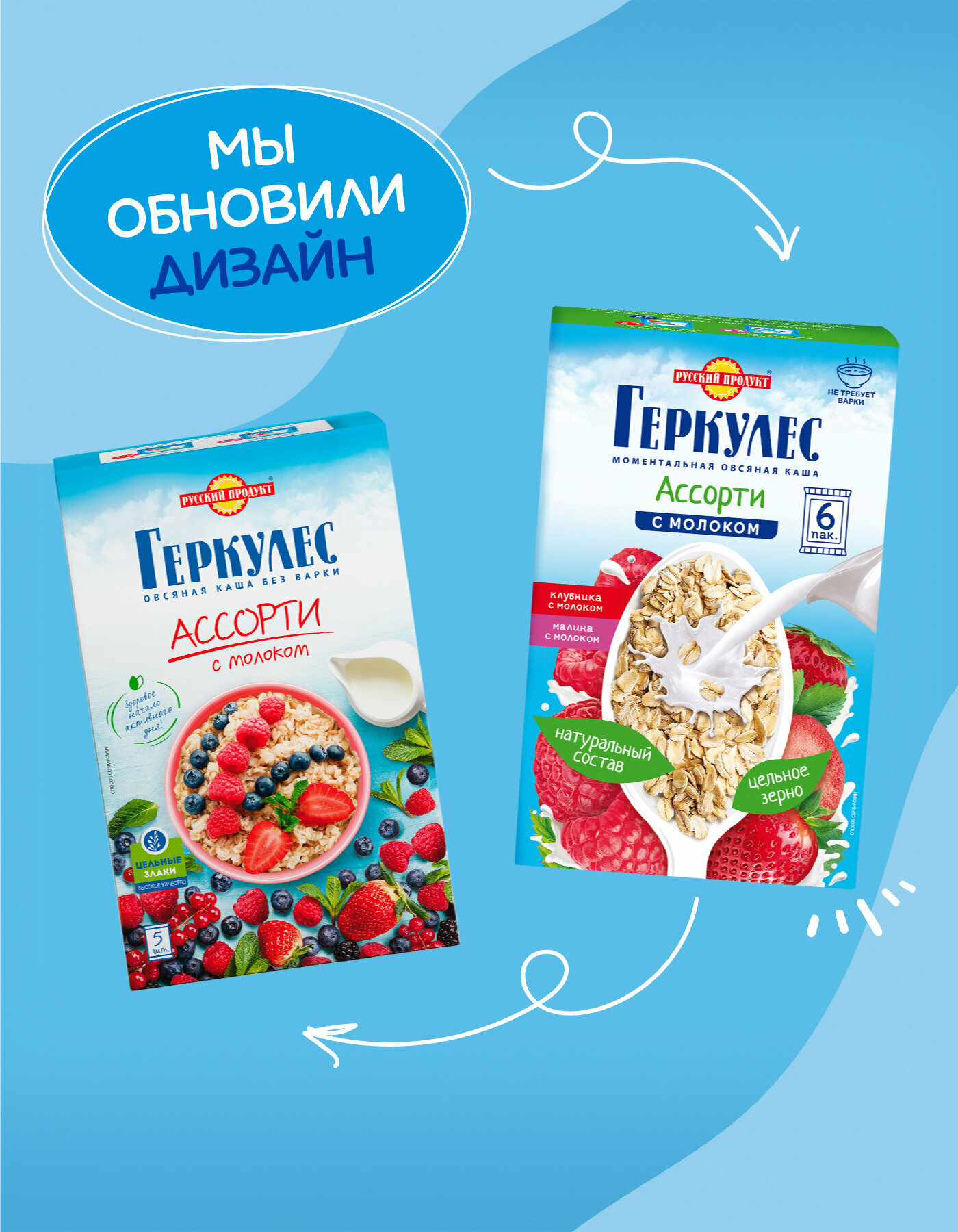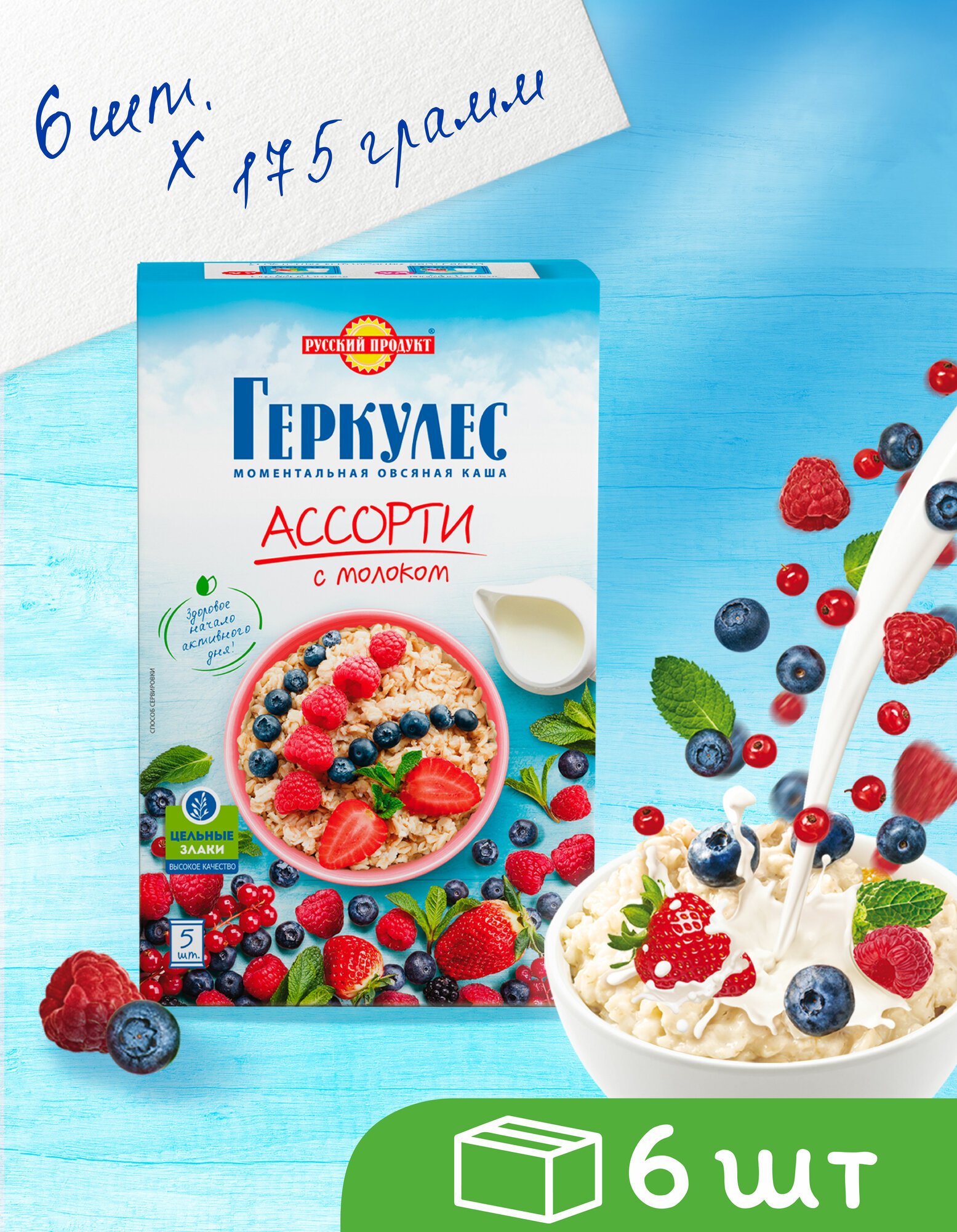 10 цен на Овсяная каша быстрого приготовления Геркулес Ассорти Классическое (малина с молоком, клубника с молоком) 175 гр (35 гр 5 шт) / 6 упаковок