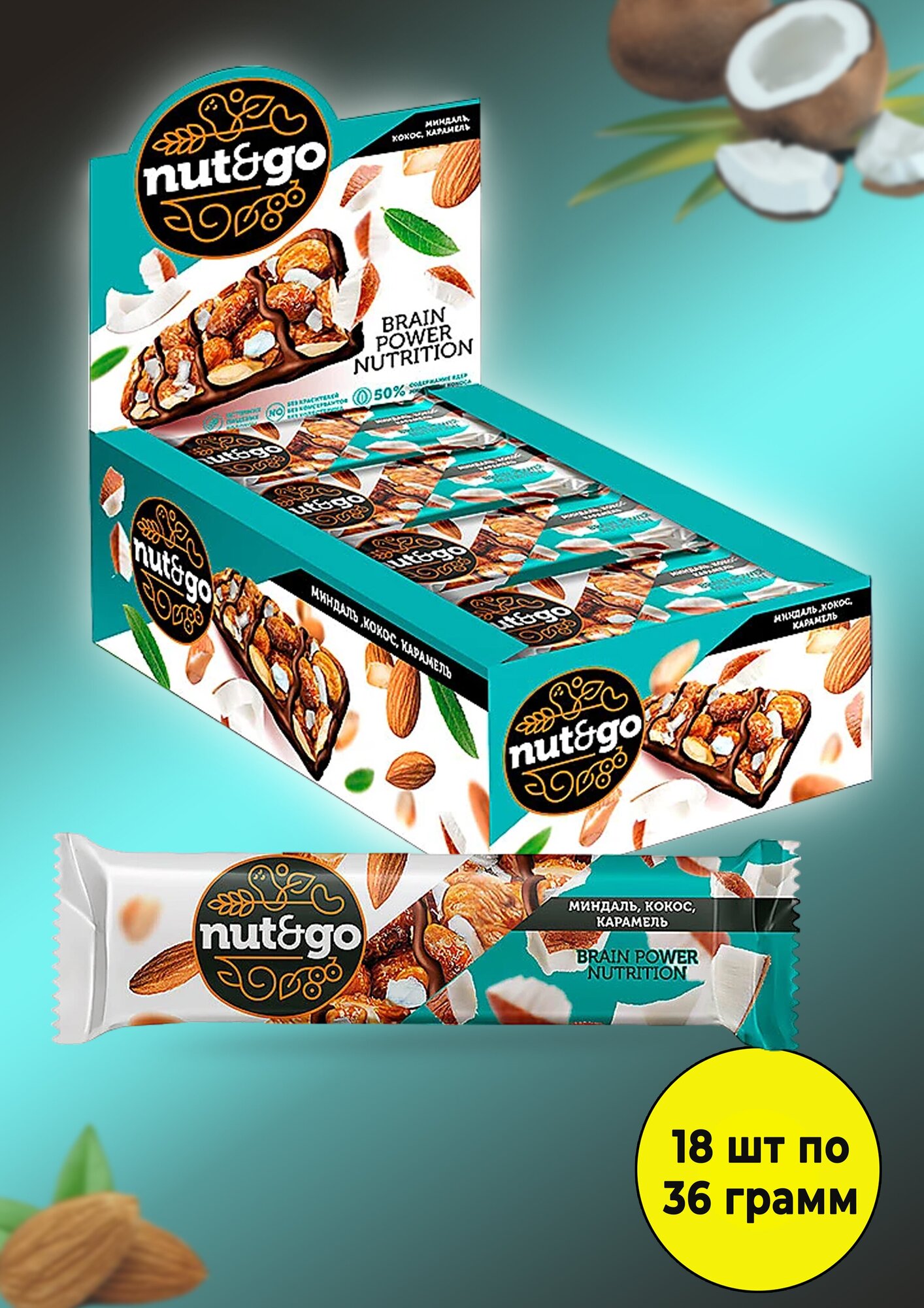 Nut and Go, батончик Almond and peanut, миндаль и арахис, 36 г (18 шт. в упаковке) 694 ₽