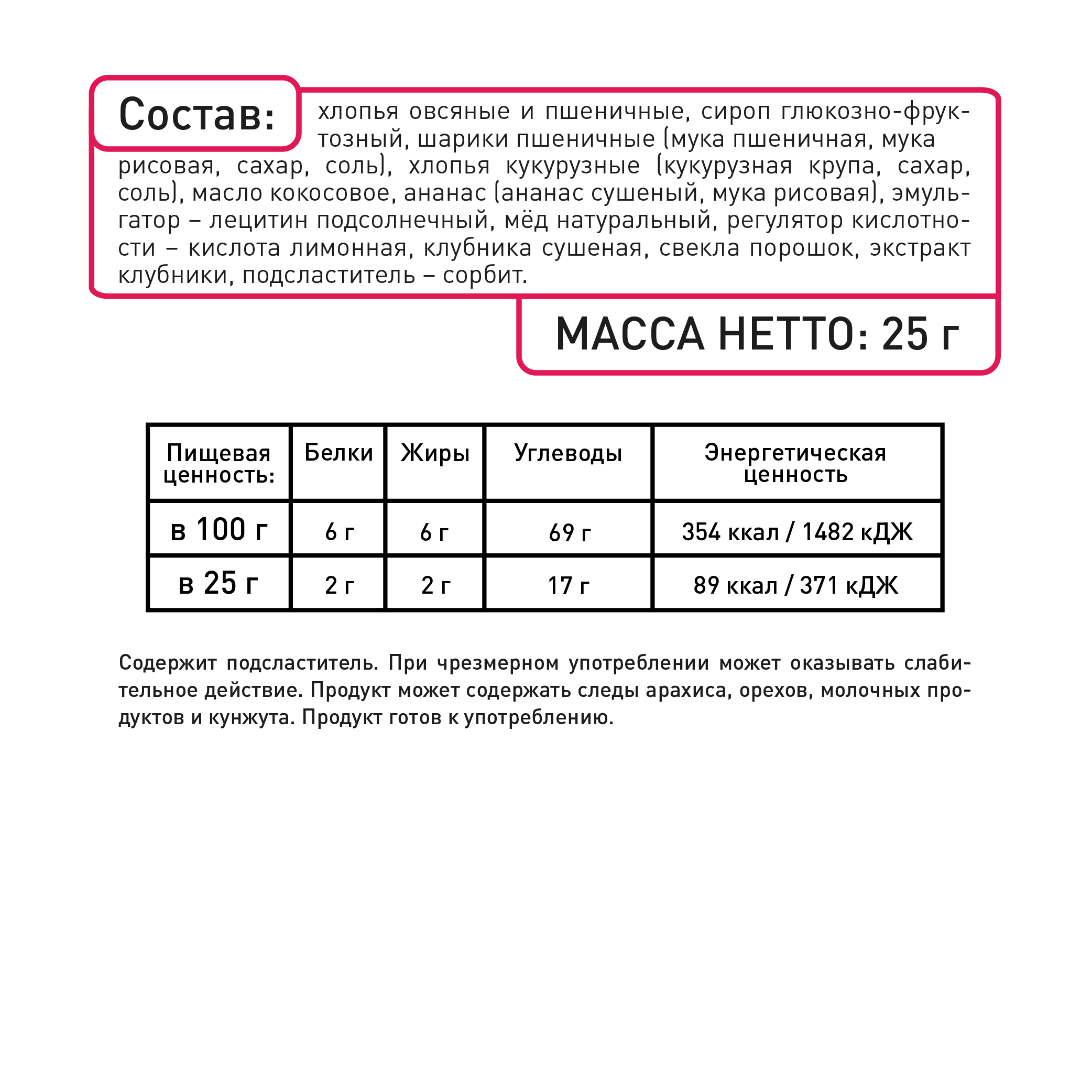 Не содержит | ГМО, искусственные добавки, искусственные красители, консерванты, пальмовое масло |