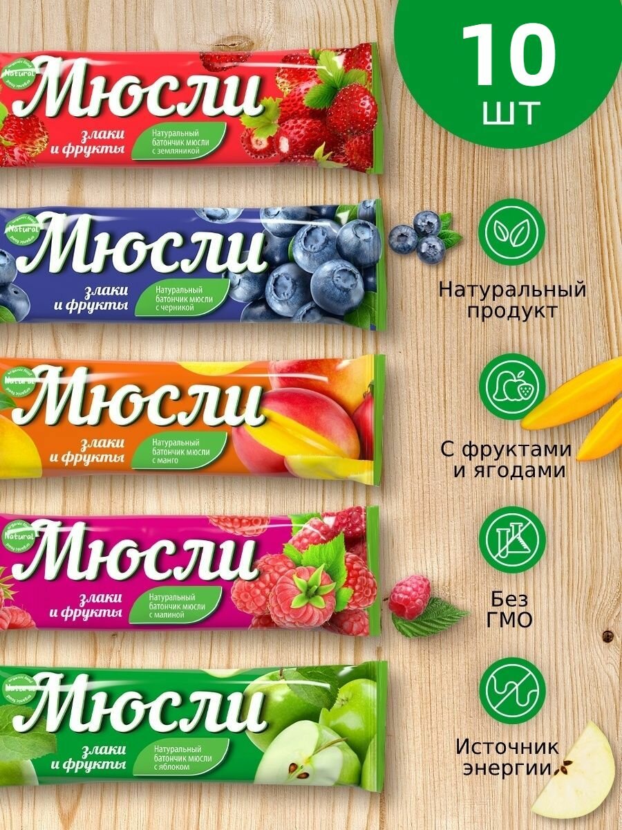 Батончики мюсли злаковые Effort без сахара ассорти: земляника, малина, манго, черника, яблоко и злаки, 10 шт по 40 гр информация: