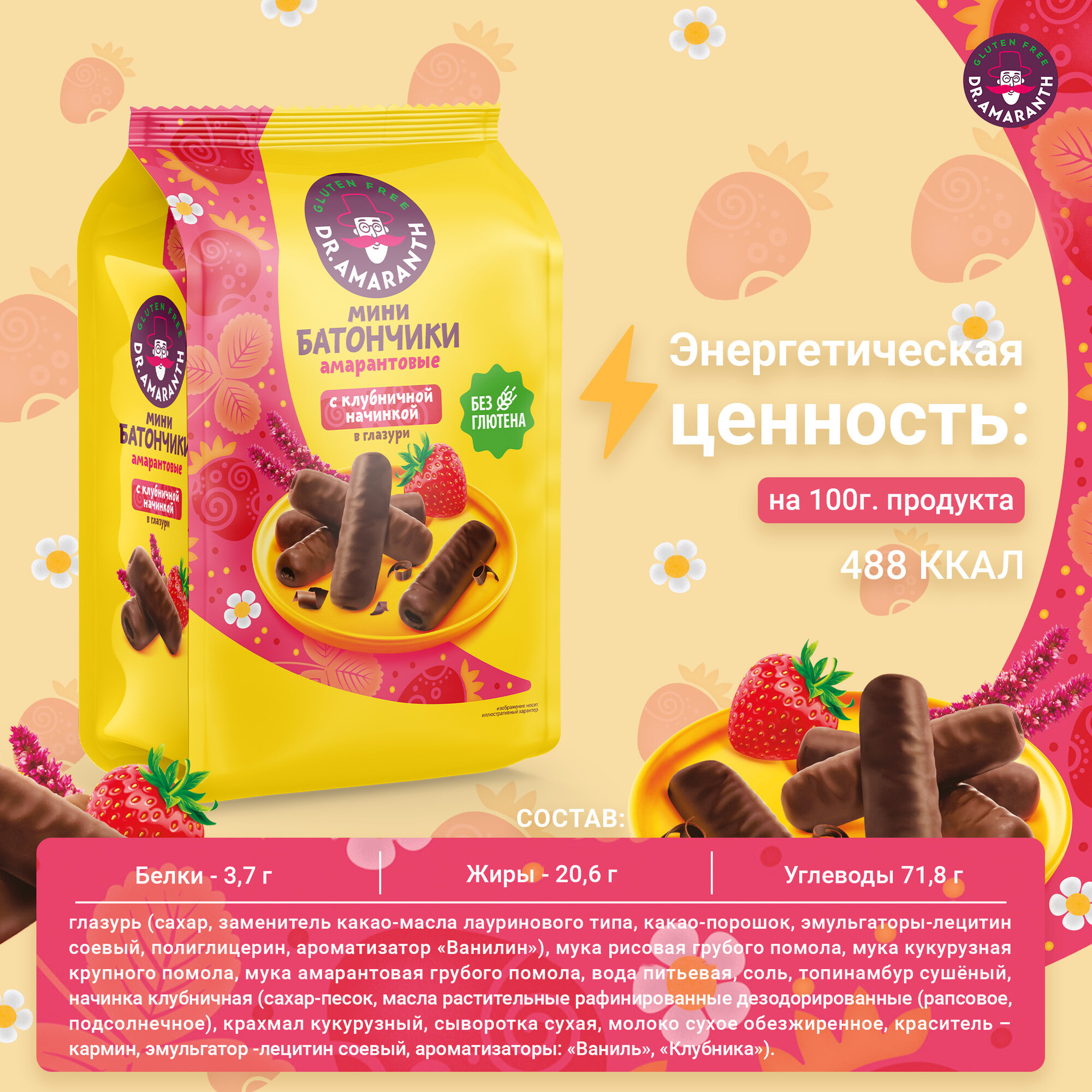 10 цен на Мини-батончики без глютена "DR.AMARANTH" с клубничной начинкой в глазури, 3шт по 100г