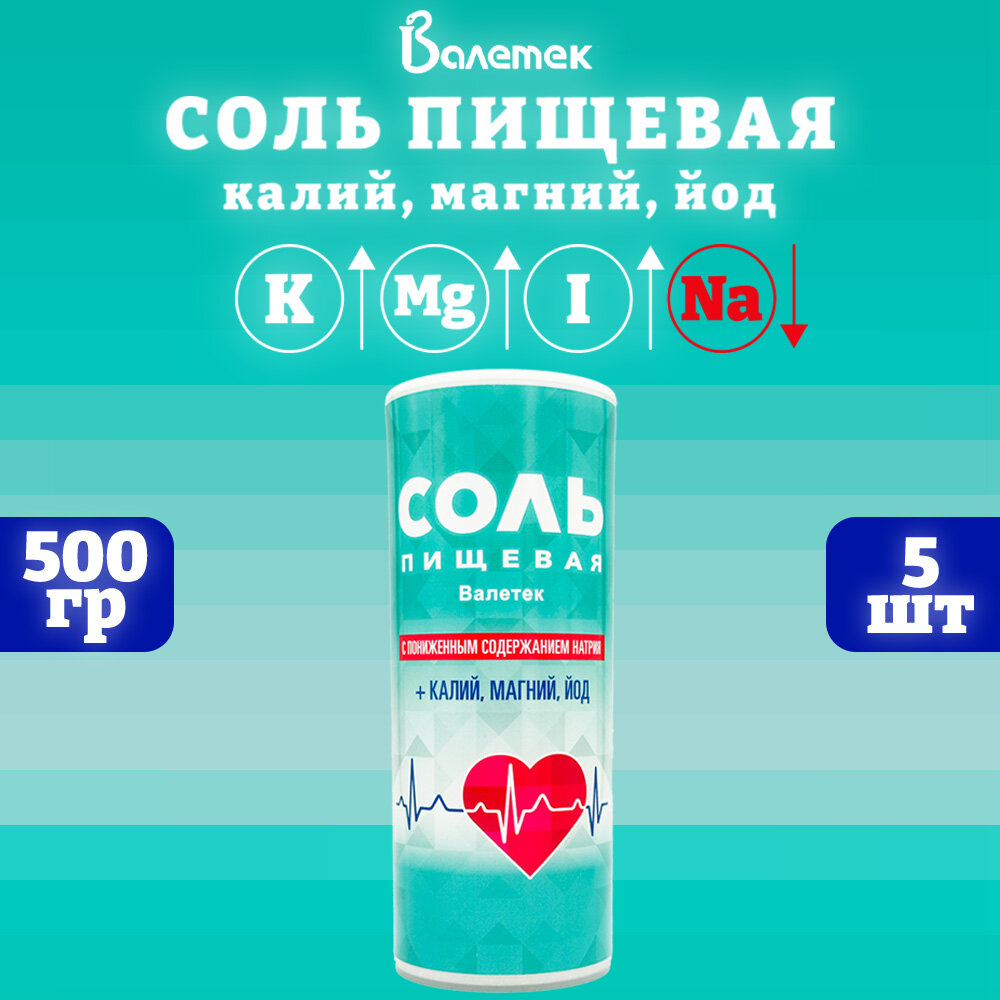 Соль пищевая калий, магний, йод, Валетек, 5 шт. по 500 г информация: