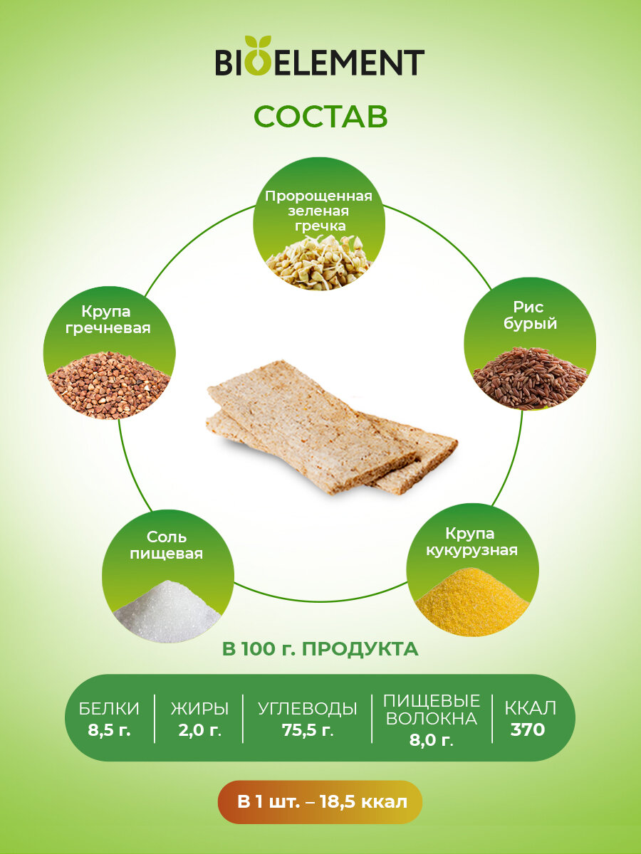 | Дополнительная информация | Наши хлебцы изготавливаются методом экструзии, их считают самыми полезными. Суть экструзии очень похожа на изготовление попкорна: заранее подготовленную смесь зёрен замачивают для смягчения грубой оболочки. После этого размягчённые зёрна в экструдере обрабатывают при высоком давлении и температуре до 300 градусов около 8 секунд. При этом вода, которой напитались зёрна, мгновенно превращается в пар, «выкручивая» зёрна наружу, а высокое давление спрессовывает их в брикет. В составе таких хлебцев исключительно цельное зерно. Такие хлебцы считаются самыми здоровыми. |