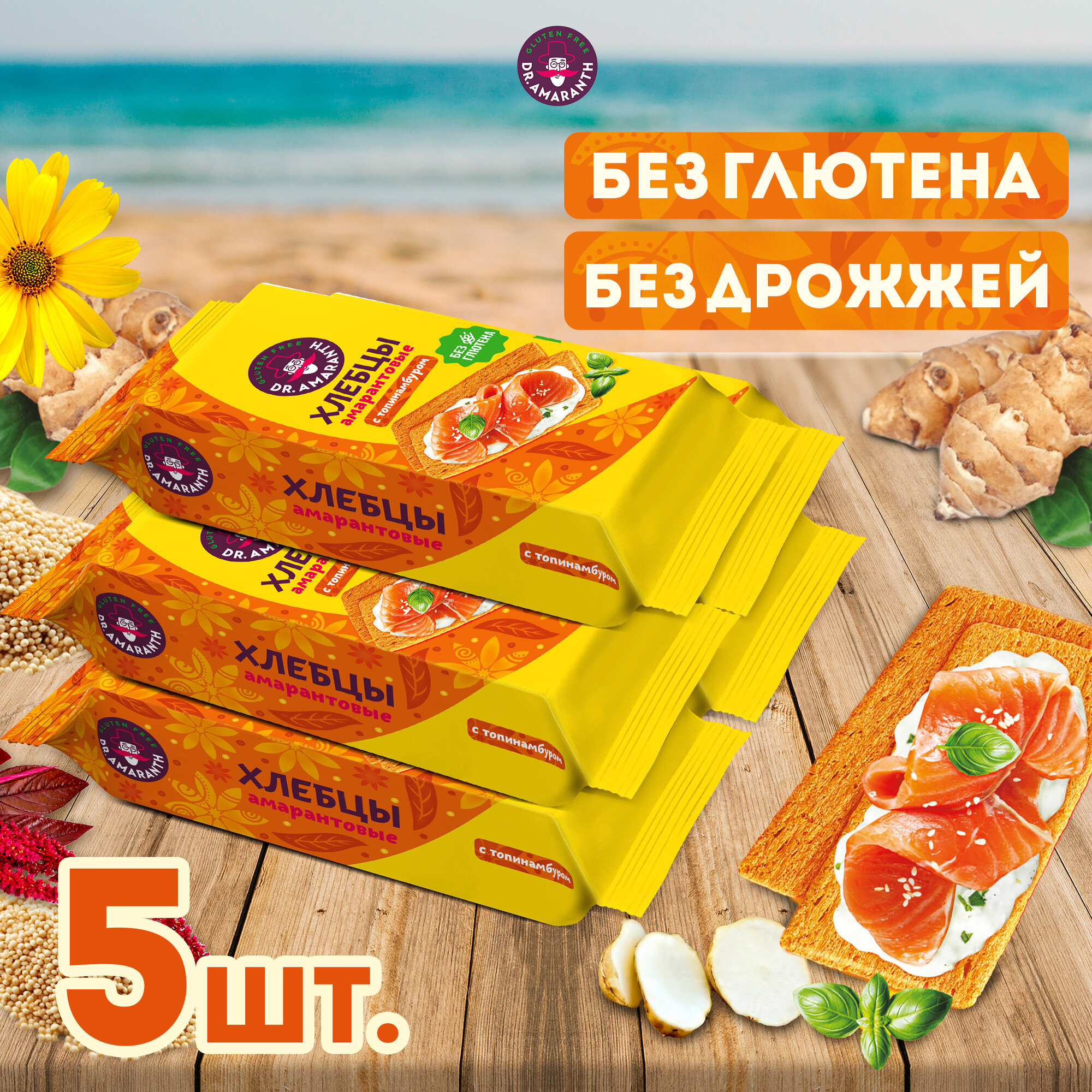 Хлебцы «Dr.AMARANTH» амарантовые без глютена с топинамбуром 5шт по 60г информация: