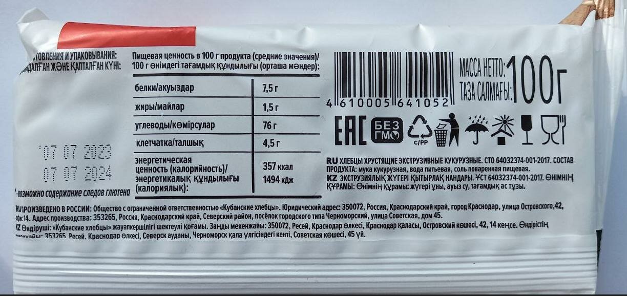 Хлебцы Кубанские хрустящие кукурузные, 100 г (5 шт в наборе) информация: