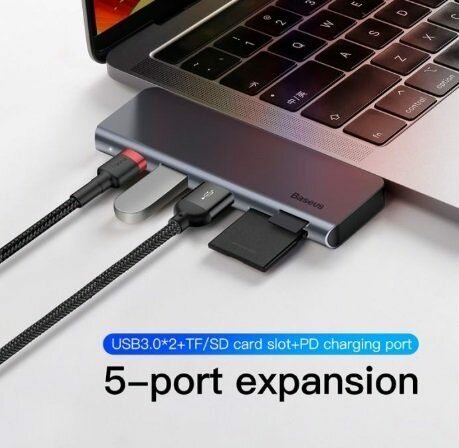 Адаптер для MacBook Baseus CAHUB-K0G, Harmonica 5in1 HUB Adapter (USB3.0 *2, SD*1, TF*1, PD*1) серый