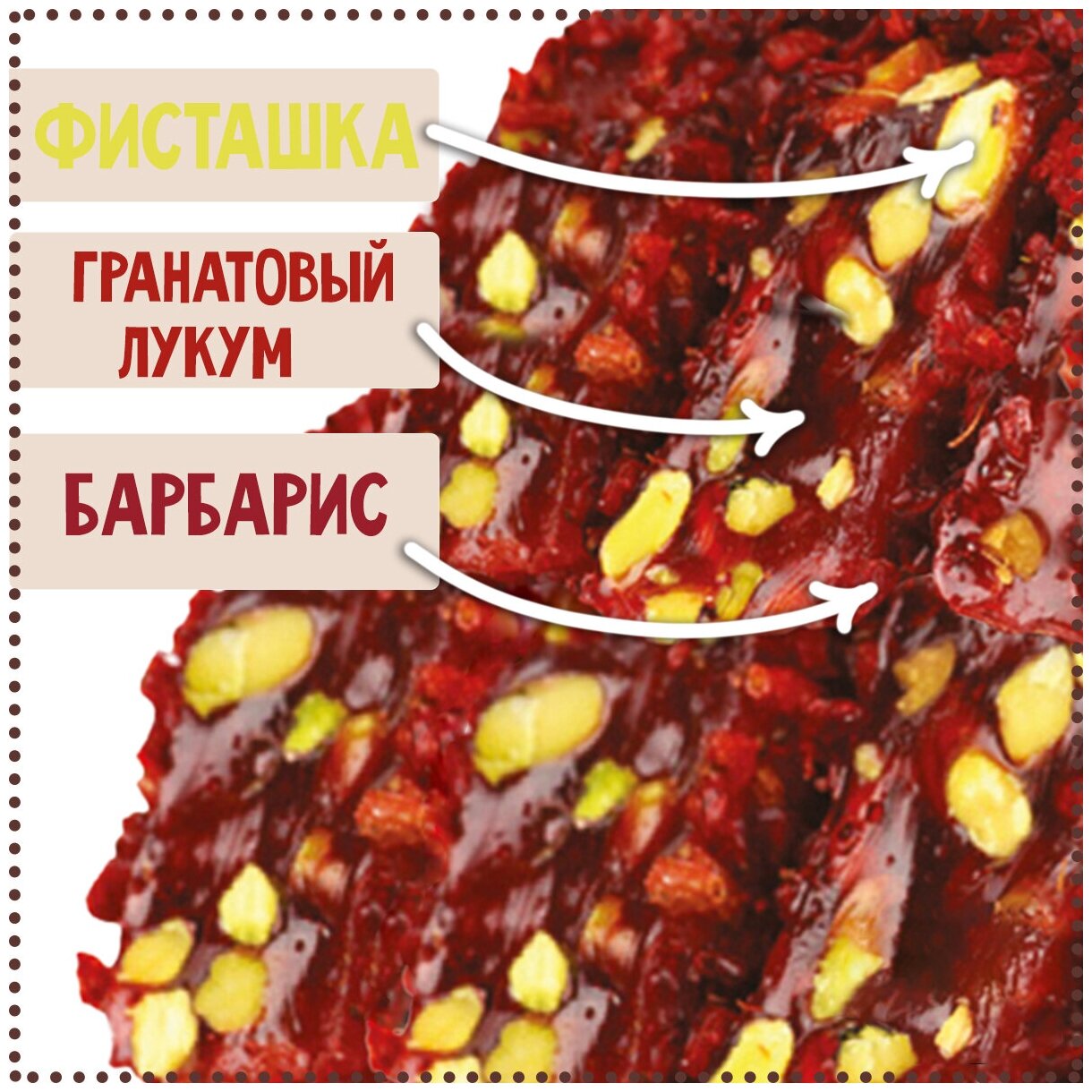 | Состав | Фруктовый сок, фисташки, сухофрукты (барбарис), лимонная кислота, сахар, кукурузный крахмал, вода. Продукт ручной работы — возможны редкие попадания фруктовых косточек, скорлупы орехов. |