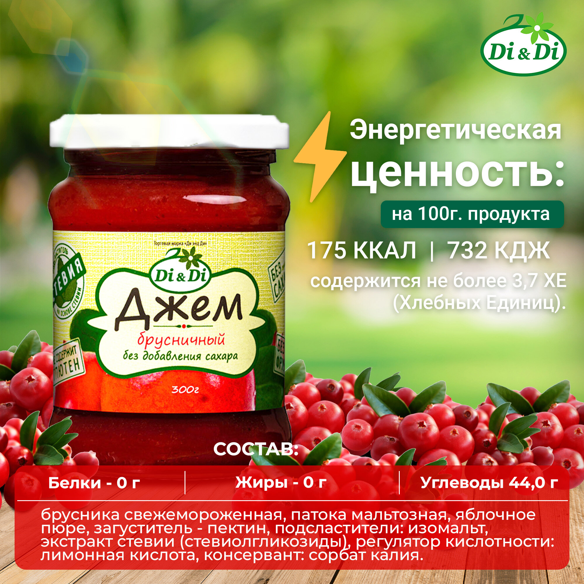 Джем брусничный Di&Di, 300 гр, (без сахара, без фруктозы и без глютена) информация: