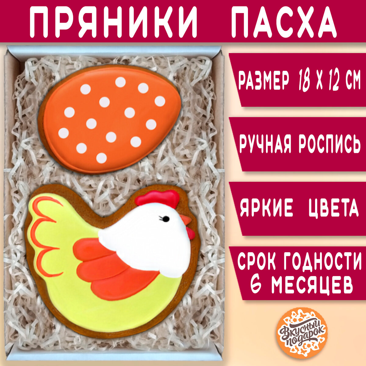 Отзывы на Подарочный набор пасхальных пряников имбирных ручной работы в подарок на Пасху детям, женщине, мужчине "Курочка и пасхальное яйцо" 18х12 см