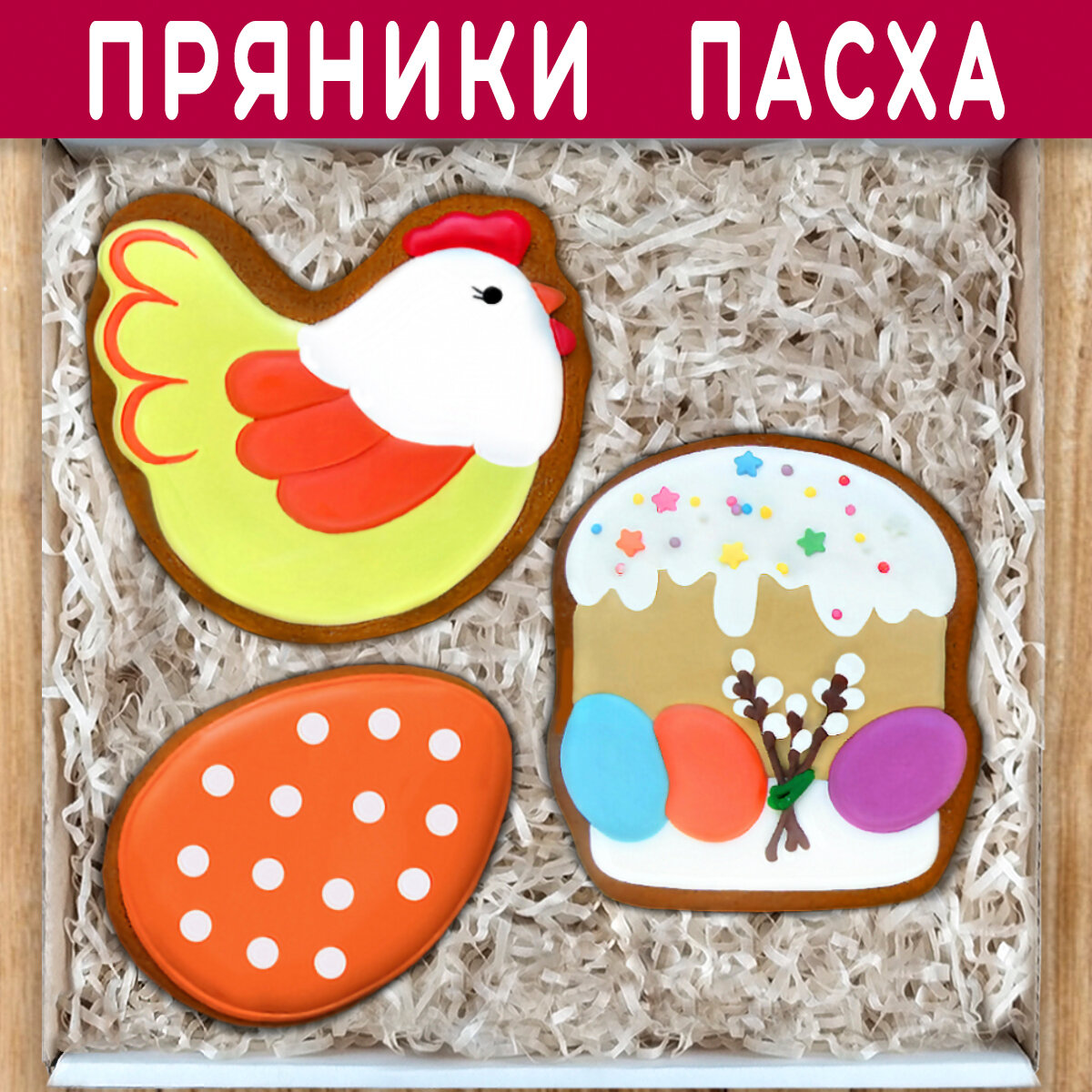 10 цен на Подарочный набор пасхальных пряников имбирных ручной работы в подарок на Пасху детям, женщине, мужчине "Кулич, курочка и пасхальное яйцо" 18х18 см