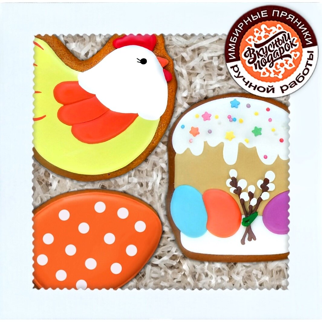 Отзывы на Подарочный набор пасхальных пряников имбирных ручной работы в подарок на Пасху детям, женщине, мужчине "Кулич, курочка и пасхальное яйцо" 18х18 см