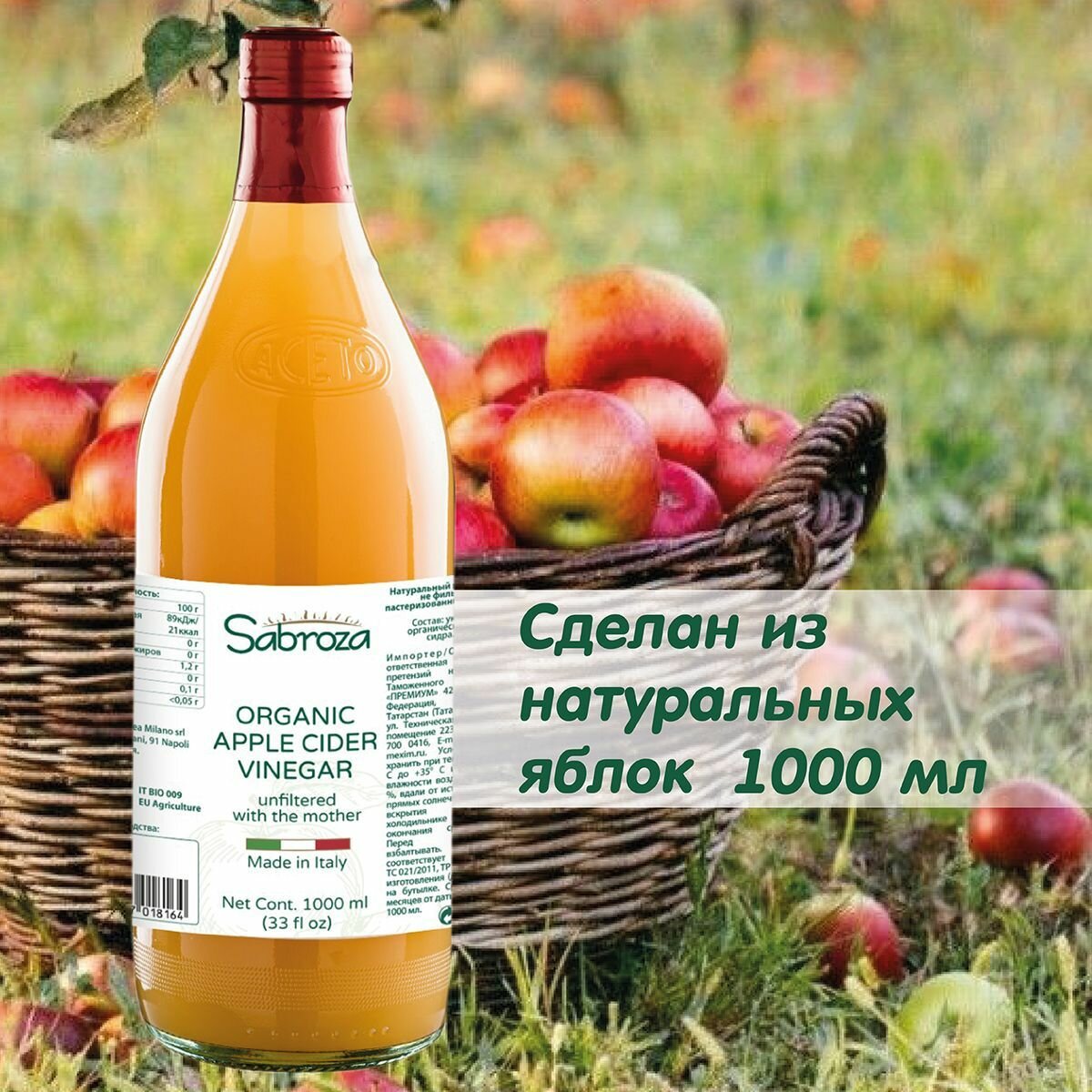 Sabroza яблочный уксус c маткой, натуральный, нефильтрованный, не пастеризованный,1 Литр, в стекле информация: