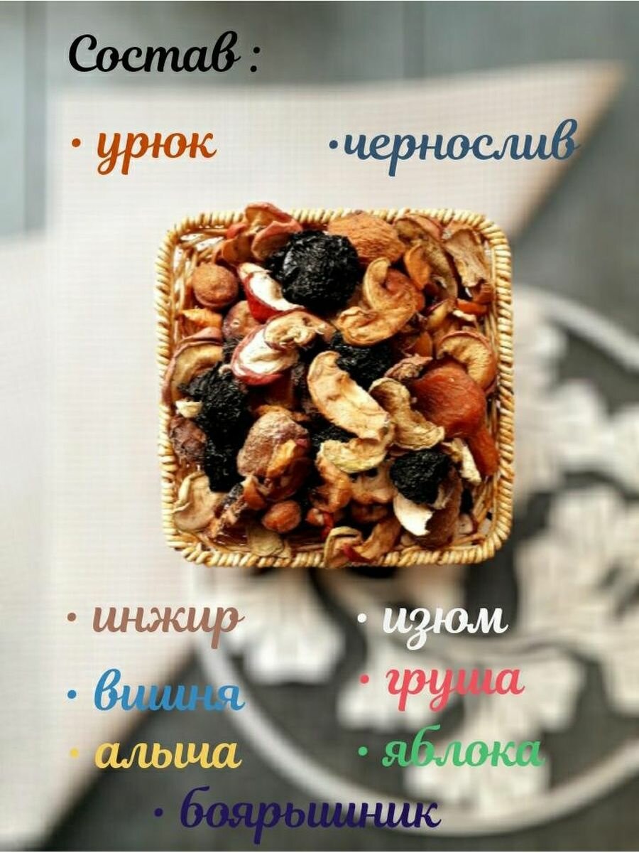 | Вид сухофруктов | алыча / боярышник / вишня / груша / изюм / инжир / слива / урюк / черешня / яблоко |