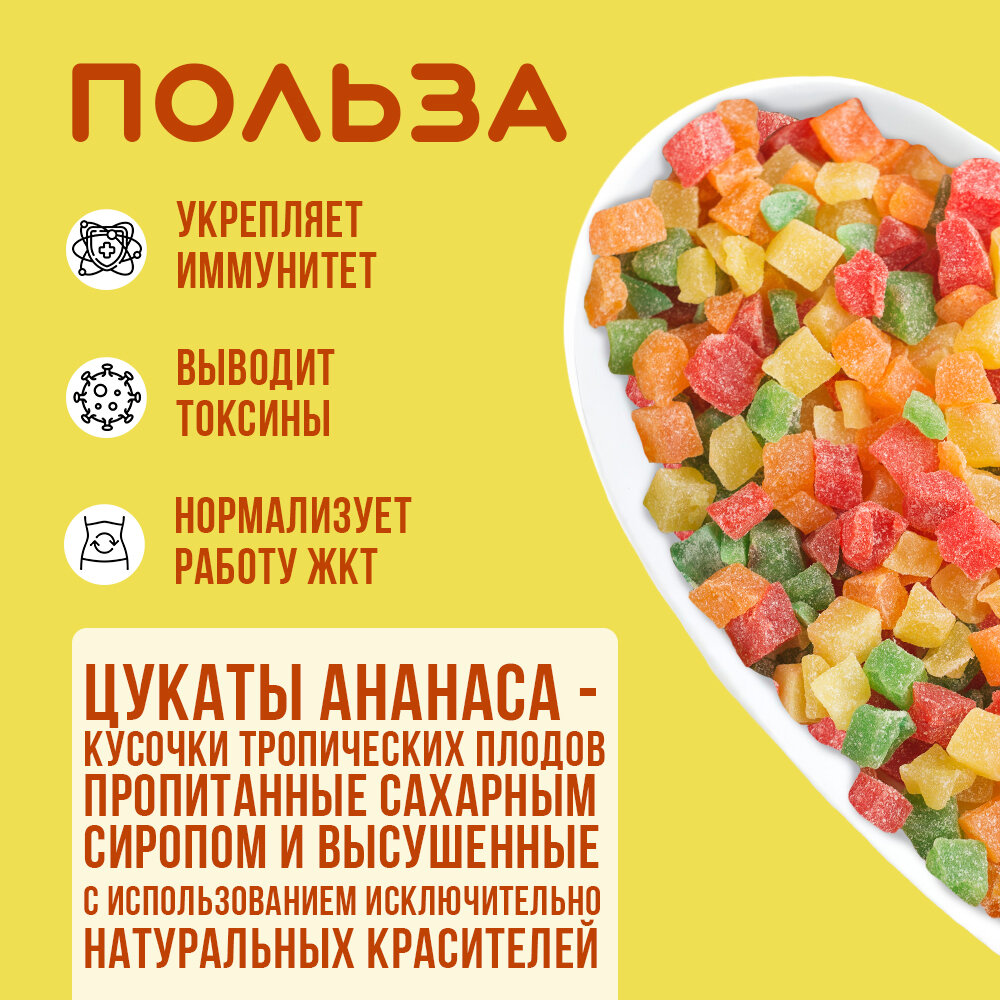 | Состав | ананас сушеный, сахар, краситель пищевой, консервант Е220 |