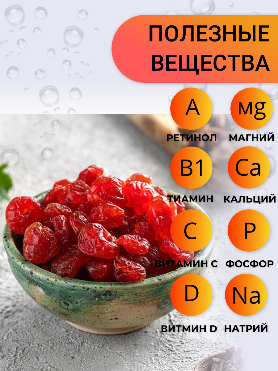 | Состав | Вишня вяленая, сахар, консервант Е220 |
