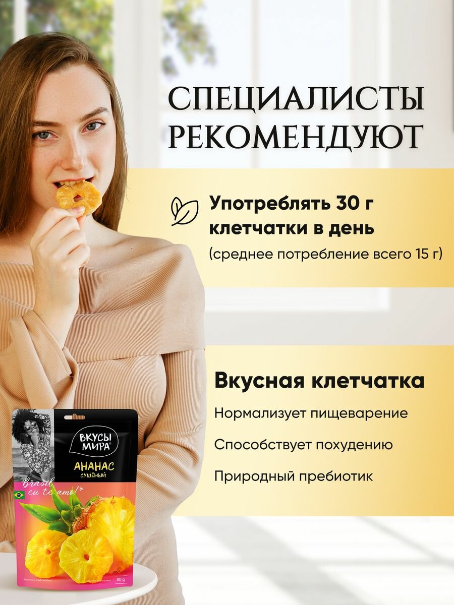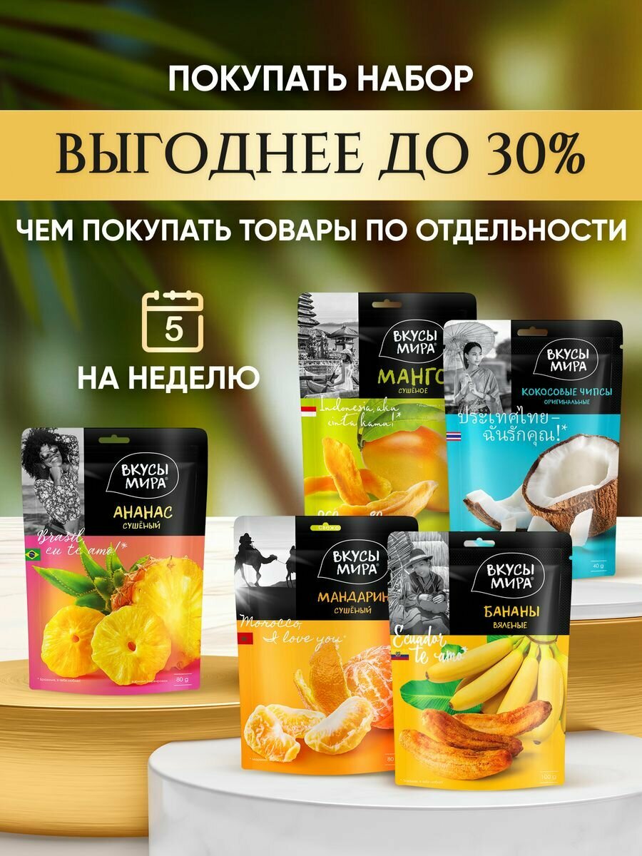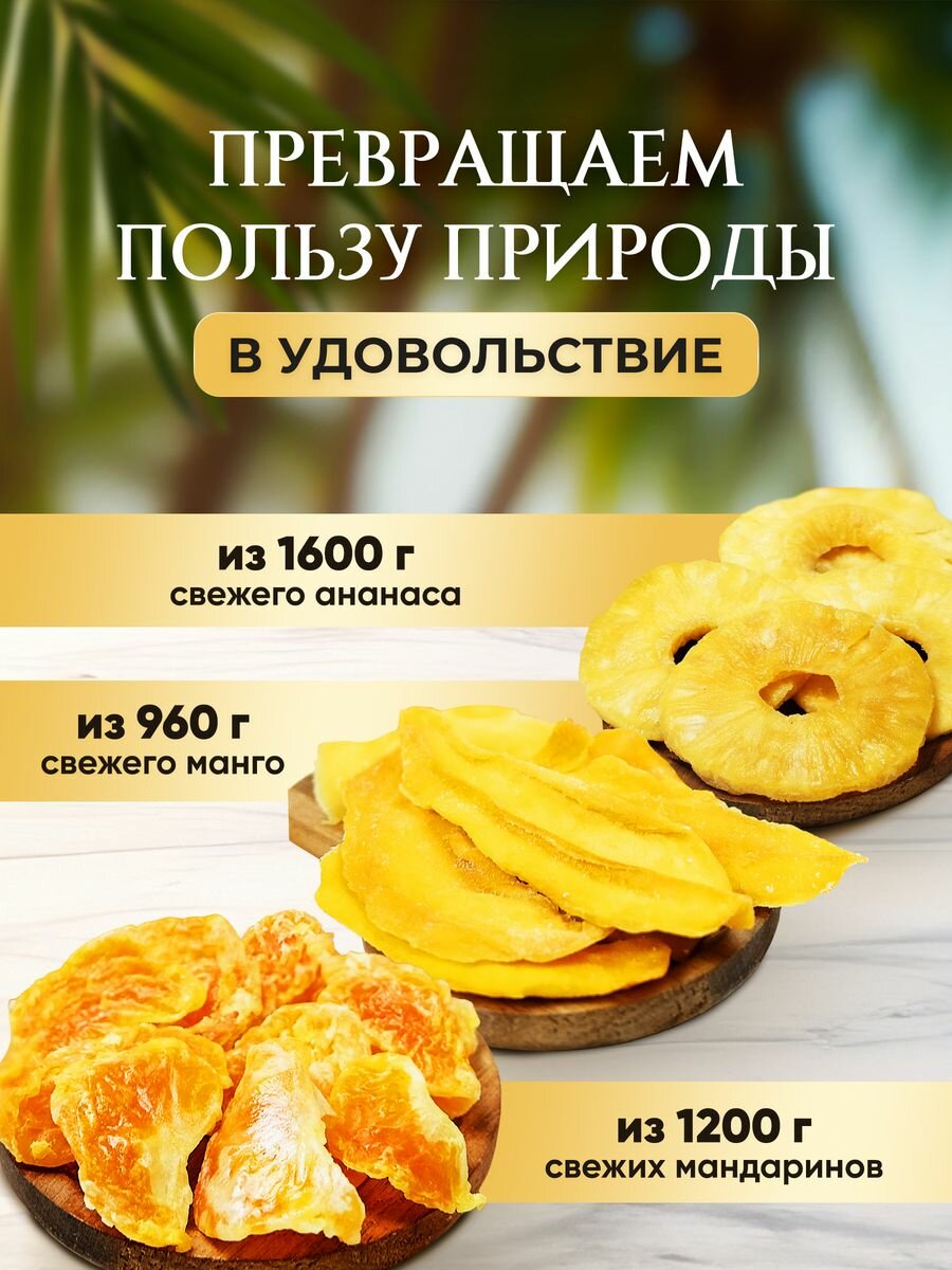 | Подробная комплектация | Кокосовые чипсы 40г, манго 80г, банан 100г, ананас 80г, мандарин 80г |