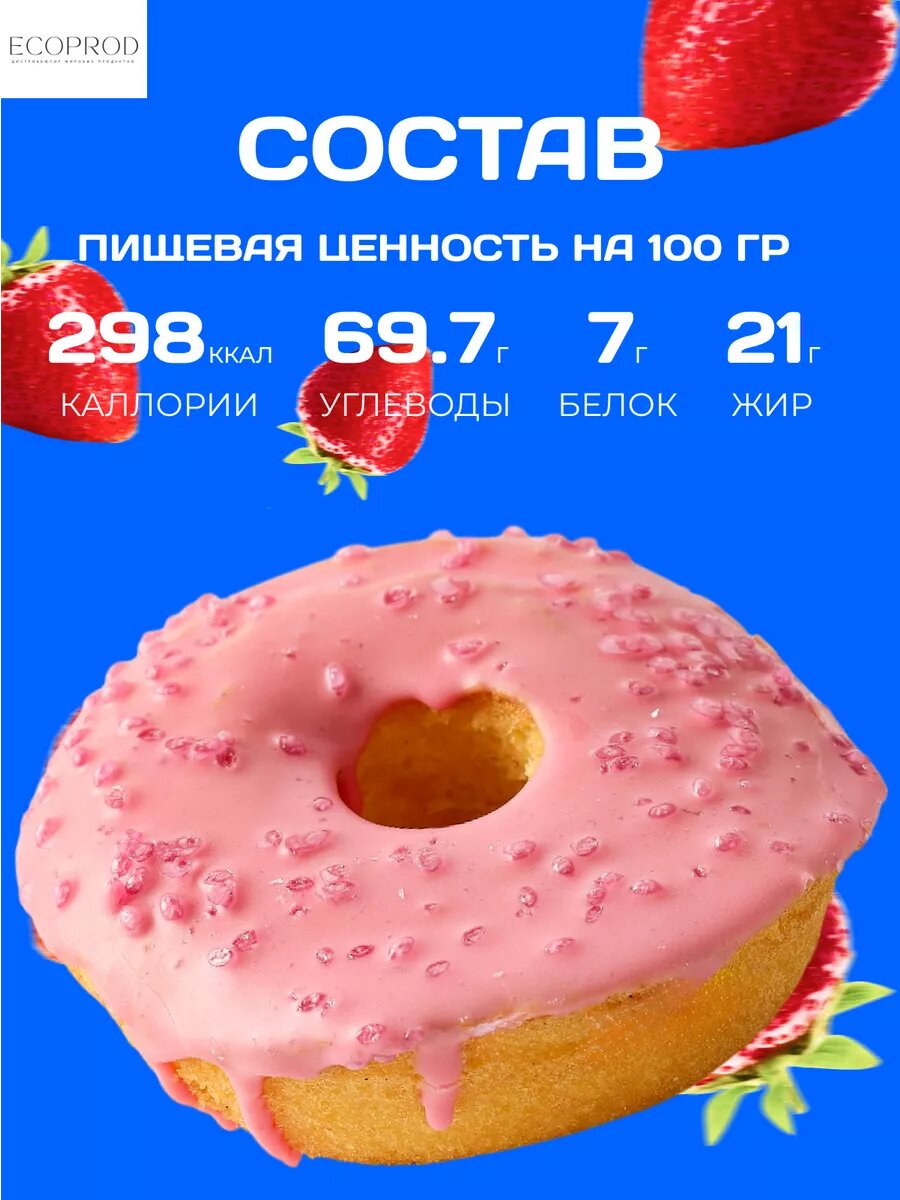 Состав | Донат (мука пшеничная, сахар, масло растительное (подсолнечное), продукты яичные, вода питьевая, масло растительное (пальмовое, подсолнечное), инвертный сироп (сахар, вода питьевая, регулятор кислотности Е330), глюкозный сироп, агент влагоудерживающий (Е420i), разрыхлитель (Е500ii, E450i, пшеничный крахмал), эмульгаторы (Е471, Е475, Е470), агенты влагоудерживающие (Е1520, Е422, Е420i), соль пищевая, ароматизатор, консервант (Е202)), глазурь (сахар, масло растительное (пальмоядровое), обезжиренное сухое молоко, эмульгатор (соевый лецитин), ароматизатор (клубничный), краситель (Е162), посыпка (глюкозный сироп, мальтодекстрин, натуральный ароматизатор, вода, концентрированный сок моркови, пшеничный крахмал, регулятор кислотности лимонная кислота). |