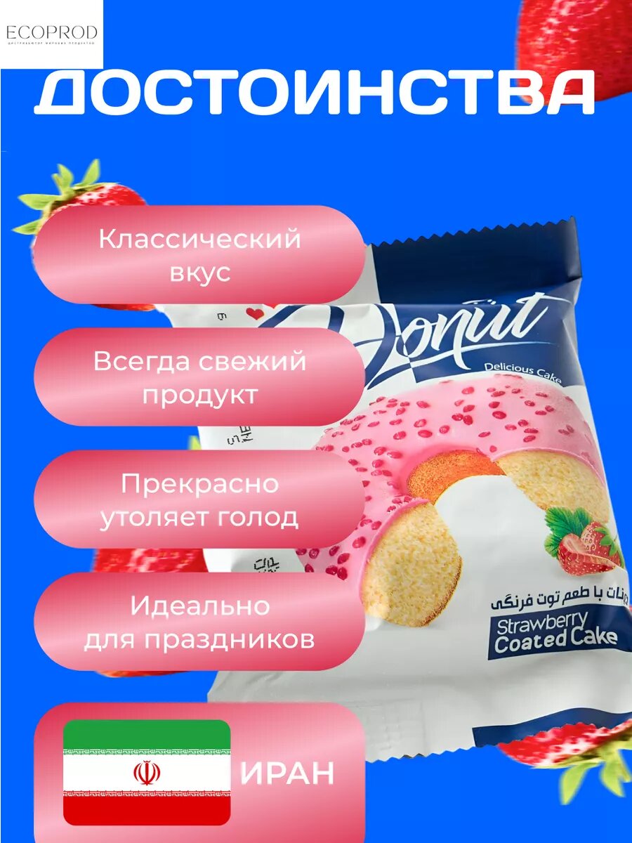Донат покрытый глазурью со вкусом "Клубники" 32 шт. х 53 гр. Пончик "Клубничный" информация: