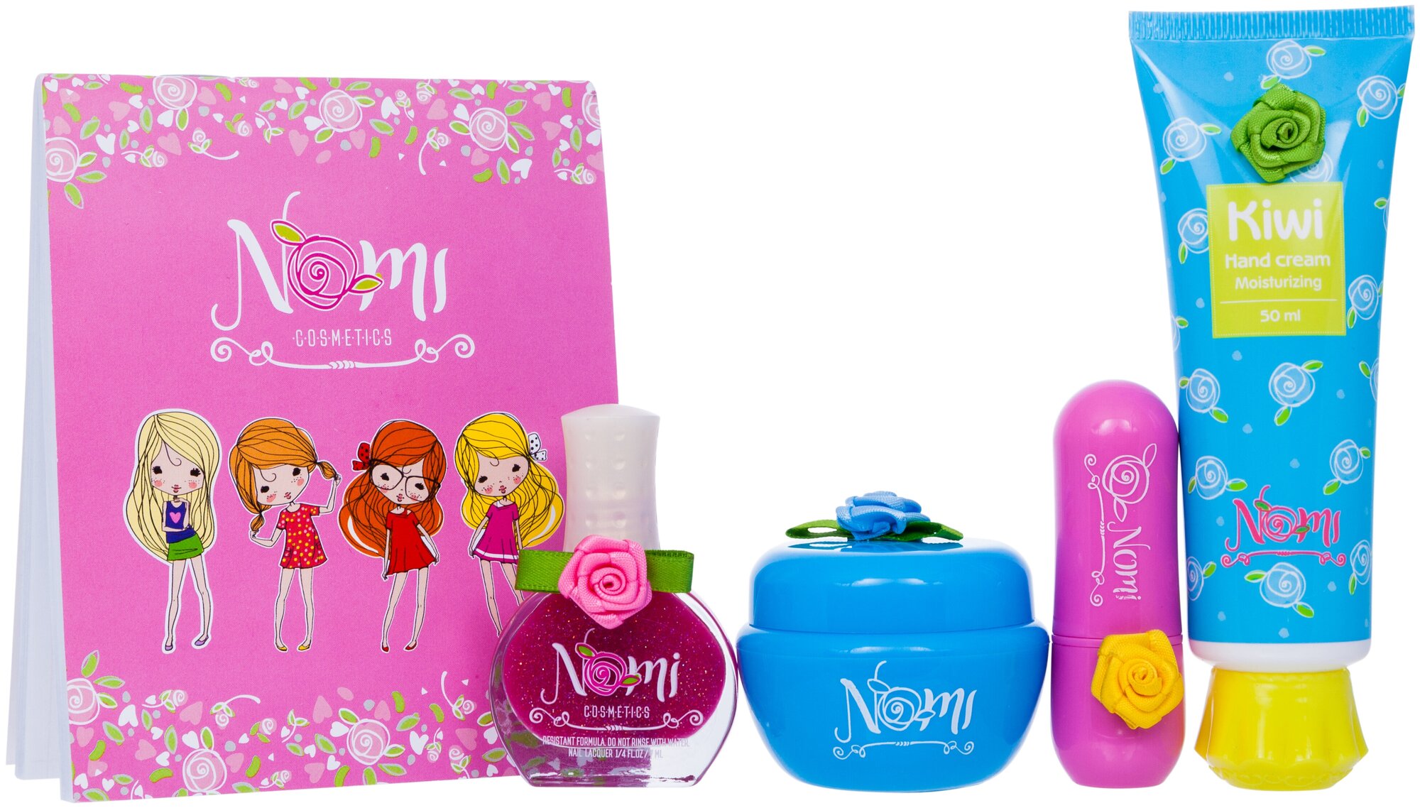Подарочный набор детской декоративной косметики NOMI "Нежное увлажнение" (блокнот, крем для рук 50 мл, крем для лица увлажняющий 30 мл, бальзам для губ 4 гр, лак для ногтей 7 мл) информация: