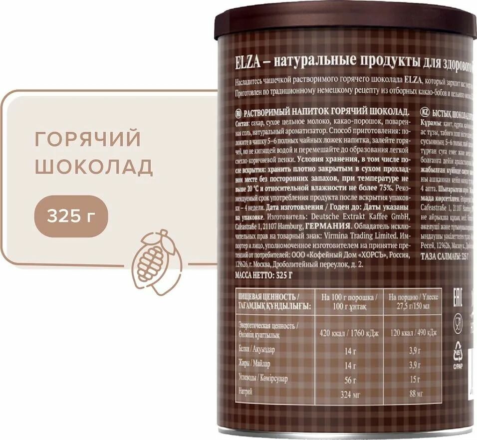 Горячий шоколад Elza HOT CHOCOLATE (Германия) 325 гр. х 4 шт. информация: