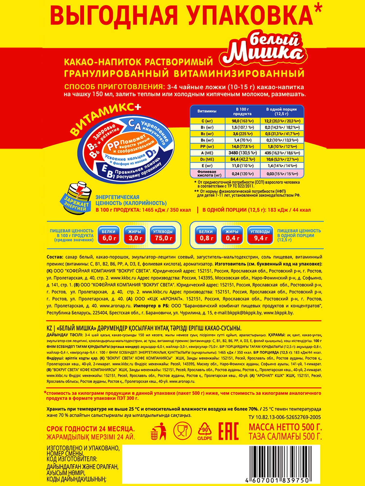 Какао-напиток гранула Белый Мишка С сахаром Быстрорастворимый 500 г информация:
