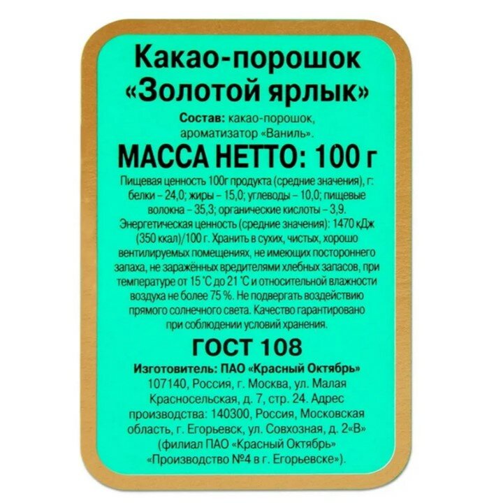 Какао Красный Октябрь Золотой Ярлык 100 гр 5 шт информация: