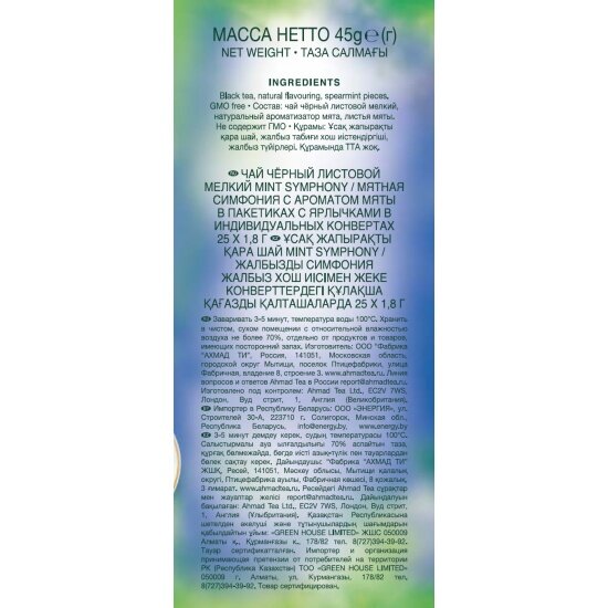 Чай черный Ahmad Tea Мятная Симфония с ароматом мяты 25 пакетиков информация: