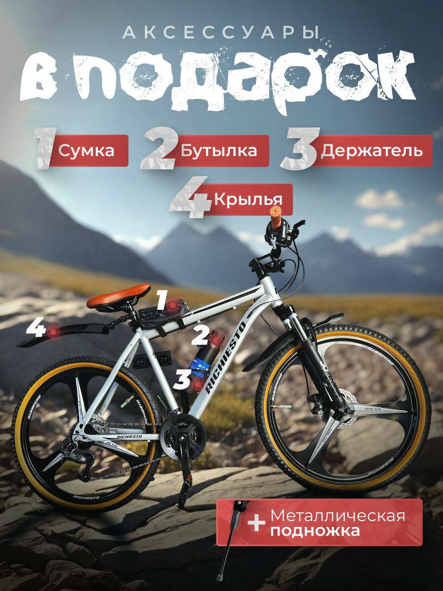 Велосипед RICHIESTO 26" на литых дисках, Горный Спортивный Унисекс, белый/коричневый