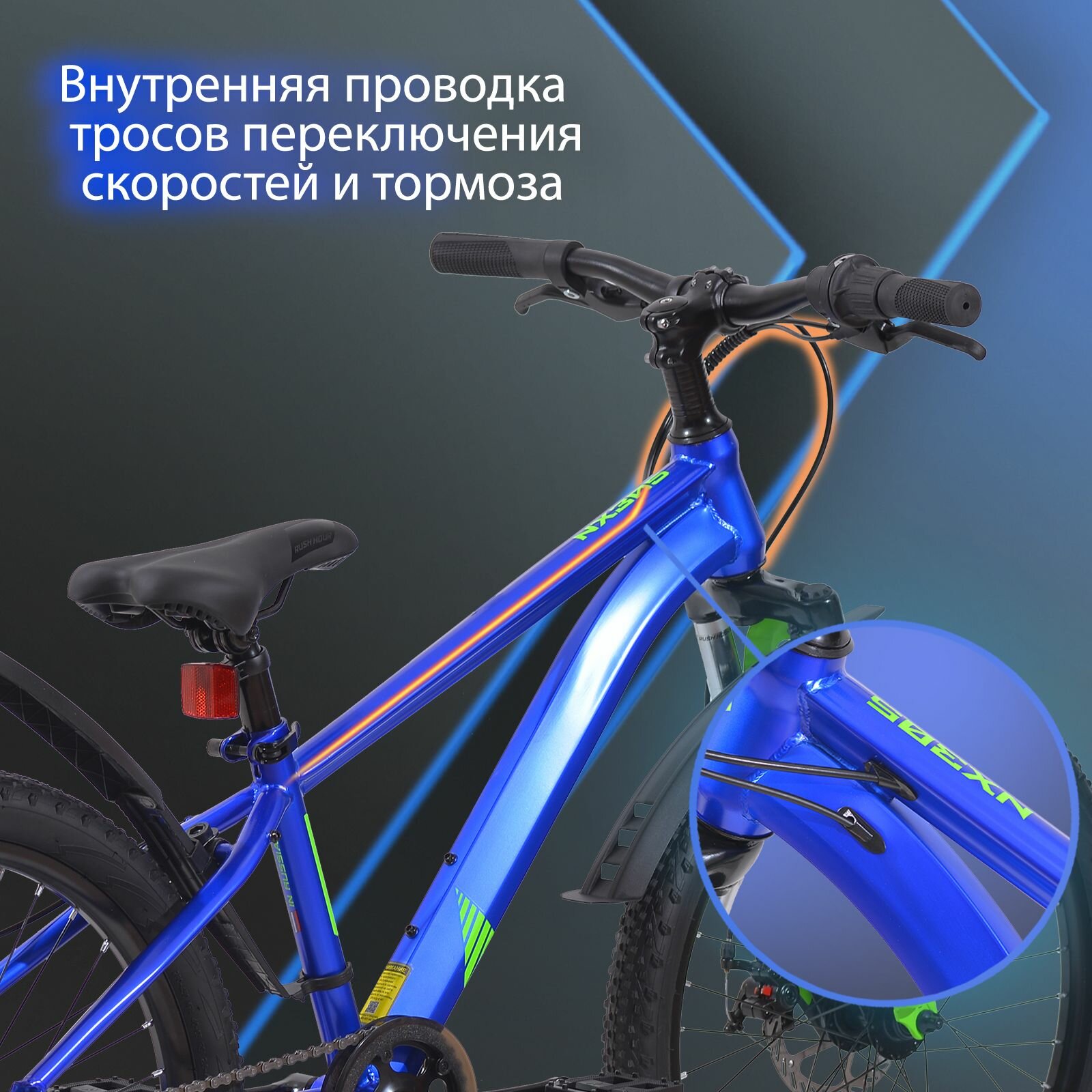 Велосипед детский горный дисковый 22" рост 125-140см 6 скоростей синий рама 12" велик 9 лет 7 лет 8 лет переключатель SHIMANO скоростной RUSH HOUR NX 305 информация: