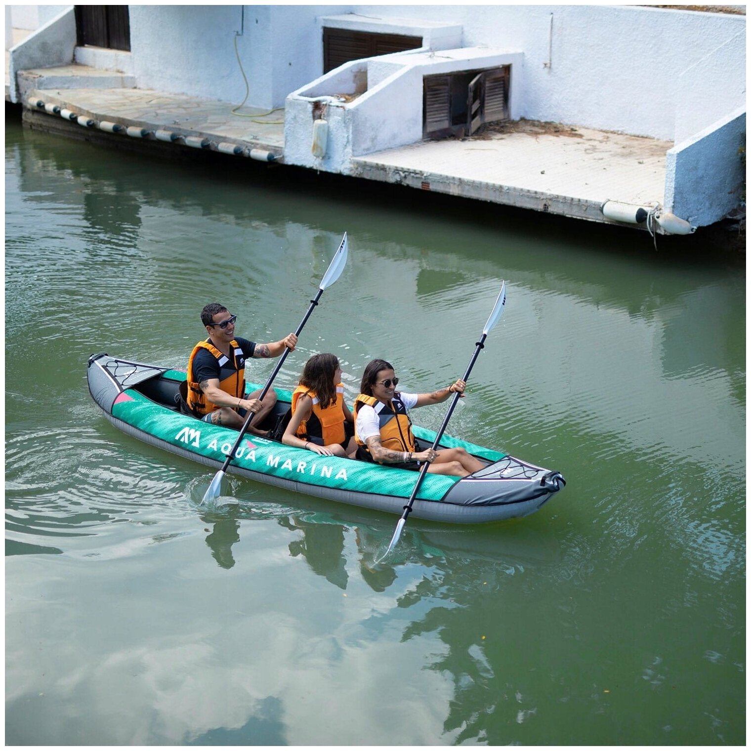Отзывы на Каяк надувной трехместный с веслами Aqua Marina Laxo-380 размеры 380x95 см, макс 210 кг, в комплекте рюкзак, насос весла сиденье, плавник (LA-380)