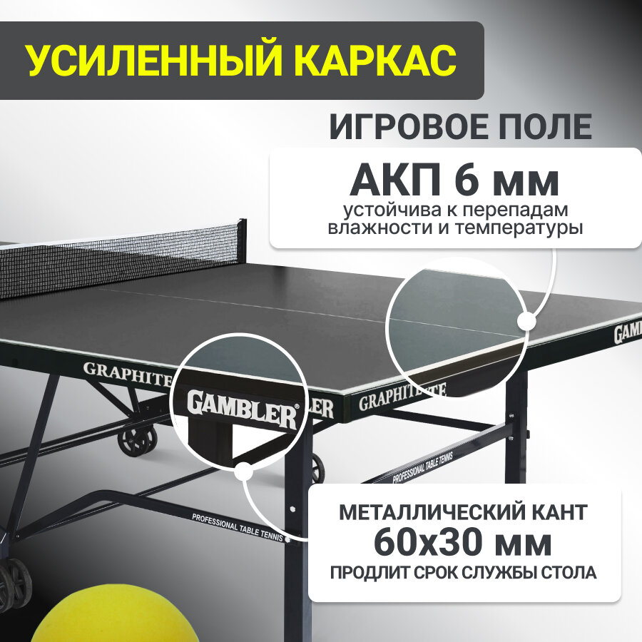 Стол теннисный Gambler GRAPHITE 6 Всепогодный, для улицы, складной, с колесами и сеткой информация: