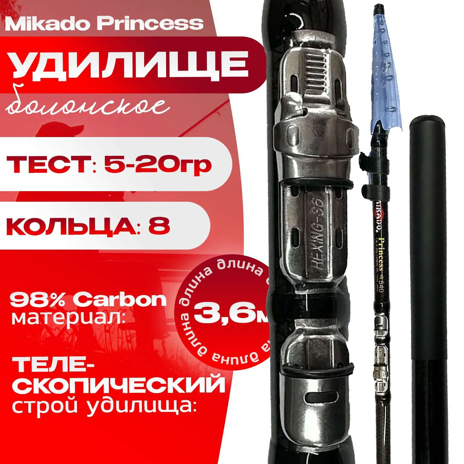 Болонское удилище 3.6 м телескопическое Mikado Princess Тест: 5-20 гр Carbon:98% информация:
