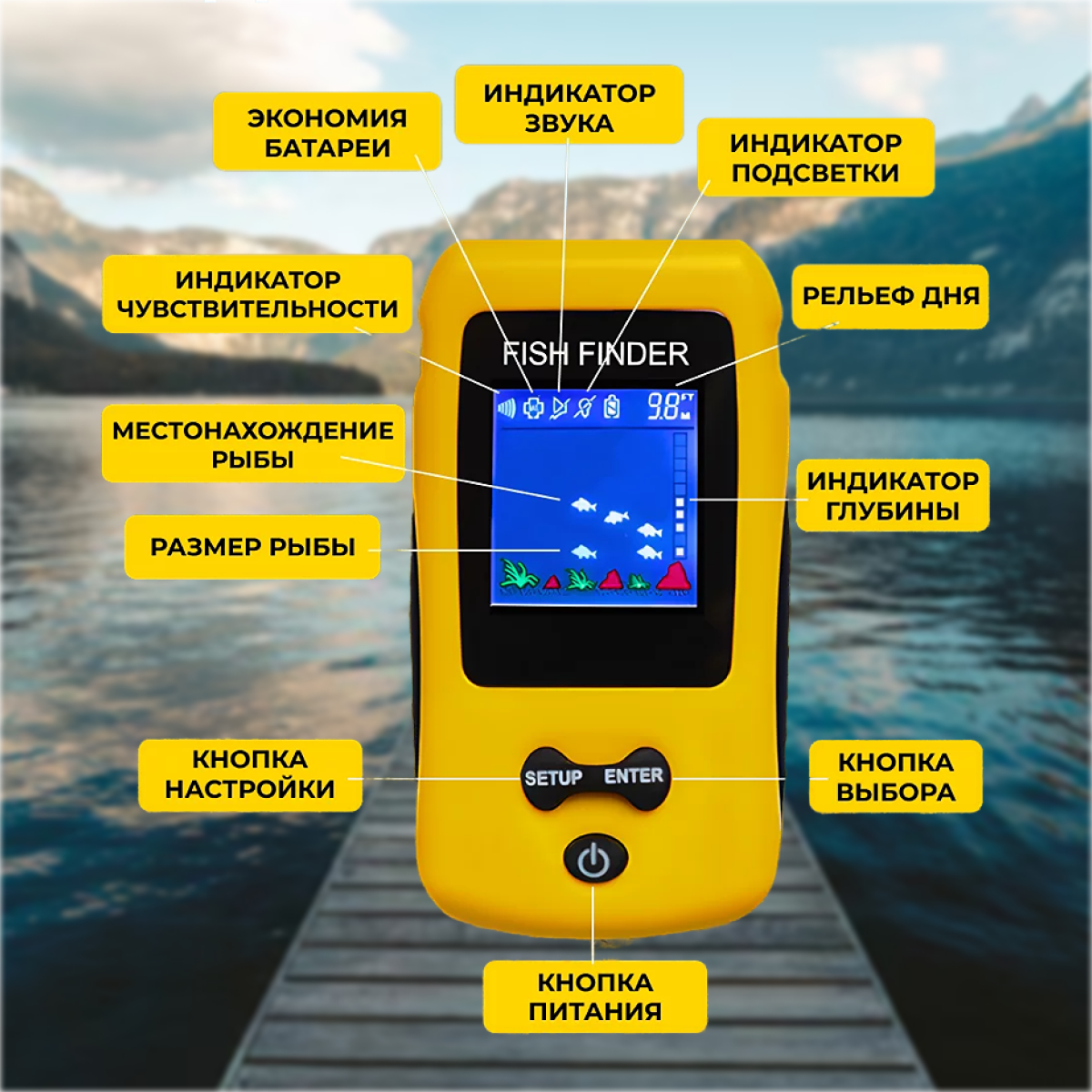 | Конструктивные особенности | беспроводной, влагозащищенный корпус, для зимней рыбалки, подсветка экрана, с дисплеем |
