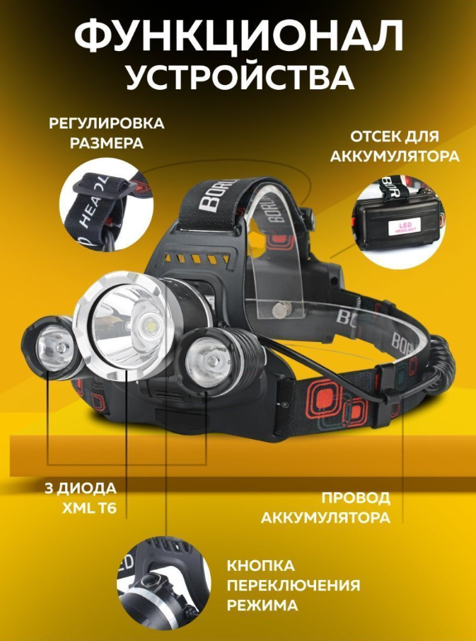 Отзывы на Налобный фонарь с тремя диодами и аккумуляторами в комплекте. Два зарядных устройства. Для рыбалки, охоты, отдыха.