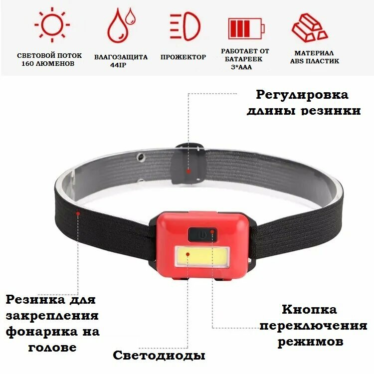 Светодиодный яркий налобный фонарь 10W COB на батарейках красный информация: